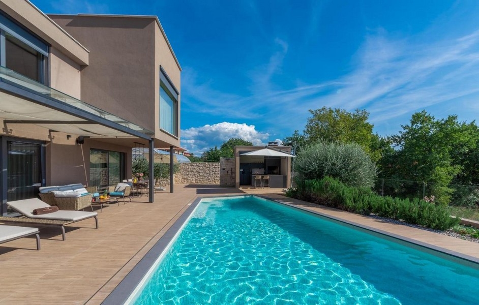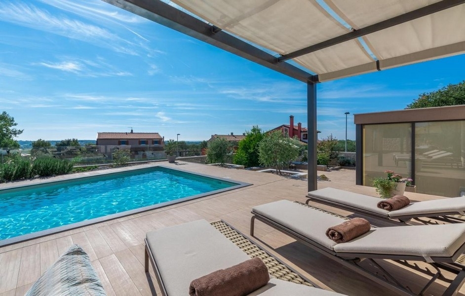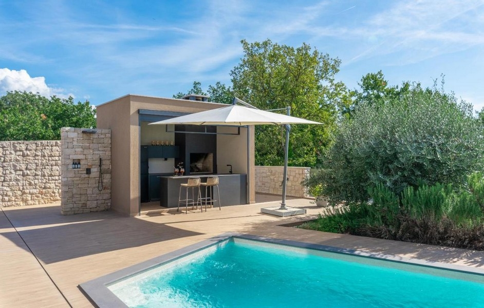 Zum Verkauf steht diese attraktive Premiumvilla mit Pool in ruhiger, mediterraner Umgebung nahe Umag in Istrien.