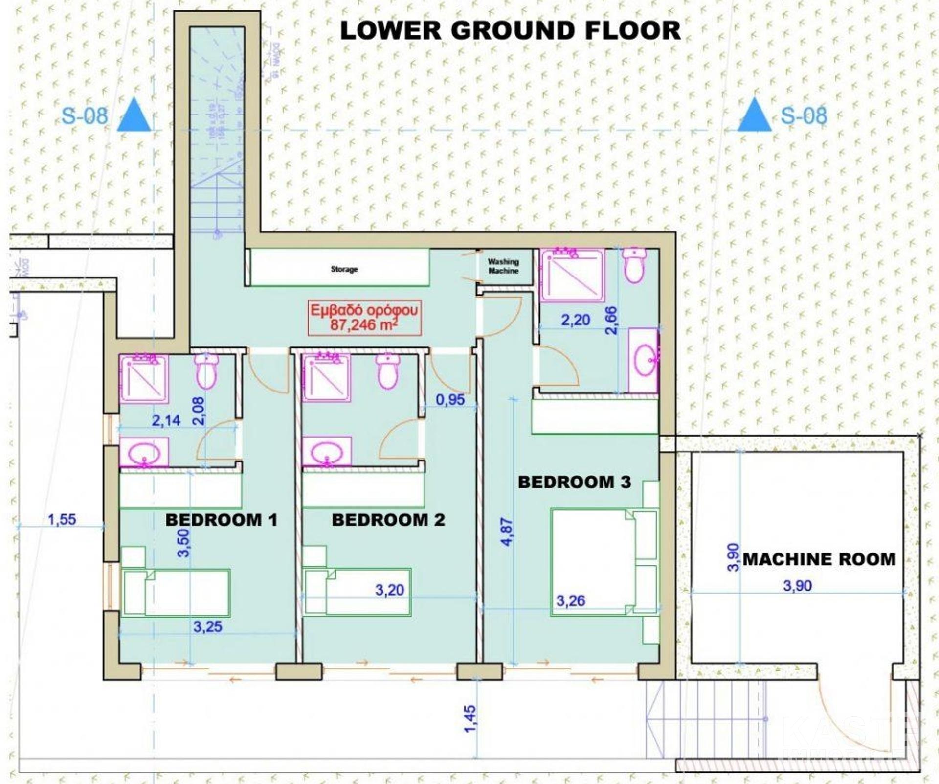 Untergeschoss (87 m²): Hier befinden sich drei Schlafzimmer, darunter das Hauptschlafzimmer, jedes mit eigenem Bad. Große Balkonschiebetüren sorgen für reichlich Tageslicht und frische Luft.