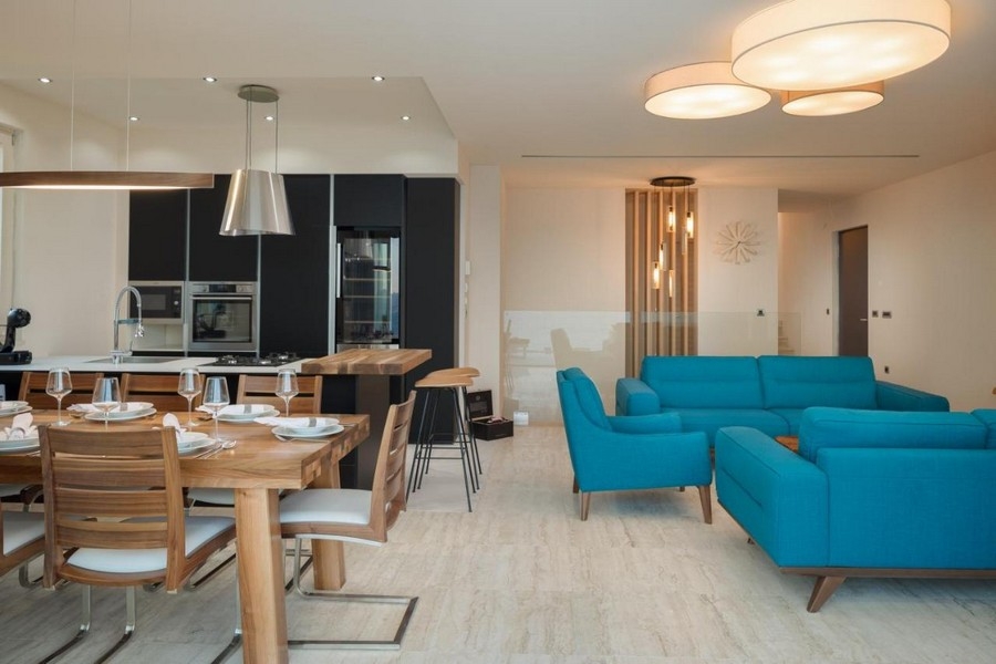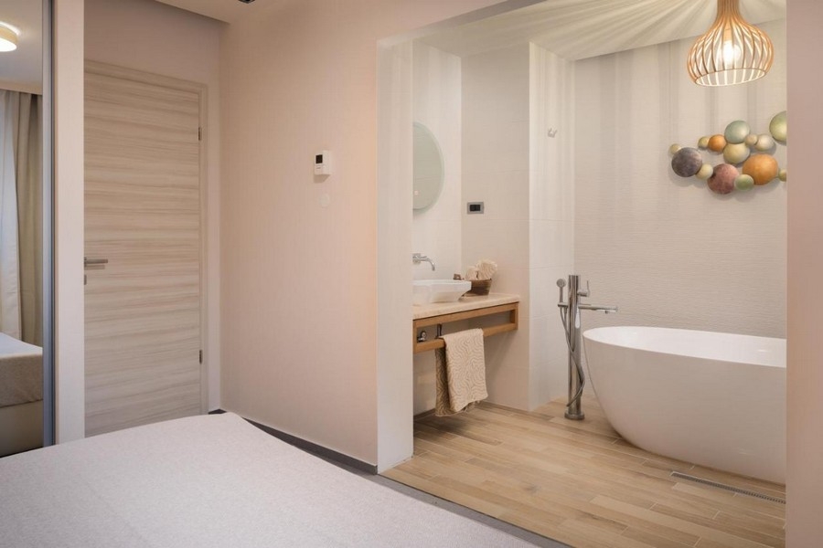 Das Anwesen wurde 2020/2021 auf einem Grundstück von etwa 379 m² leicht oberhalb der Küstenstraße fertiggestellt. Die Gesamtfläche von rund 289 m² verteilt sich auf vier Schlafzimmer, drei Bäder, einen Wohnbereich mit offener Küche und Esszone, einen Wellnessbereich mit Sauna sowie Balkone und Terrassen mit Panoramablick auf das Meer.