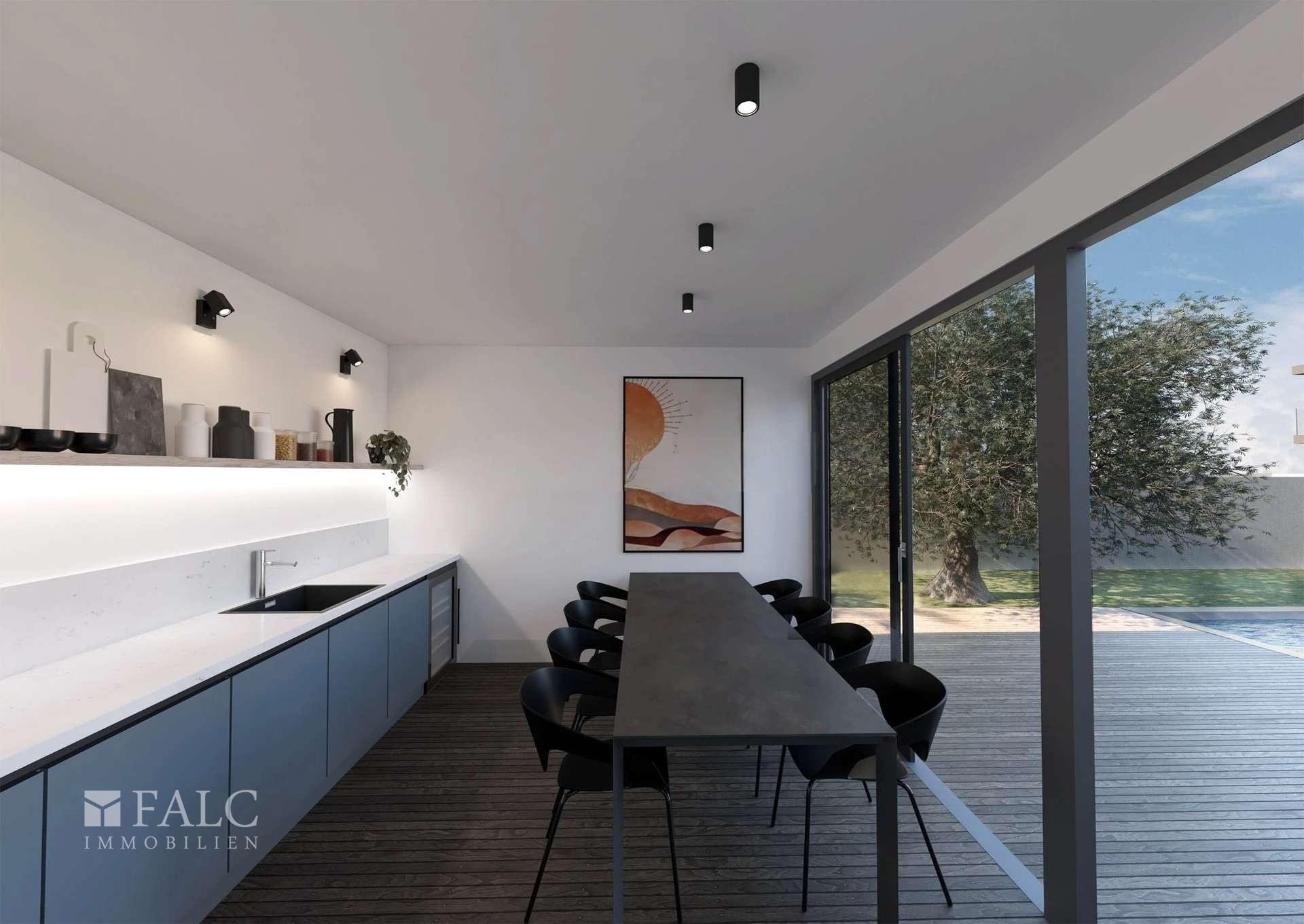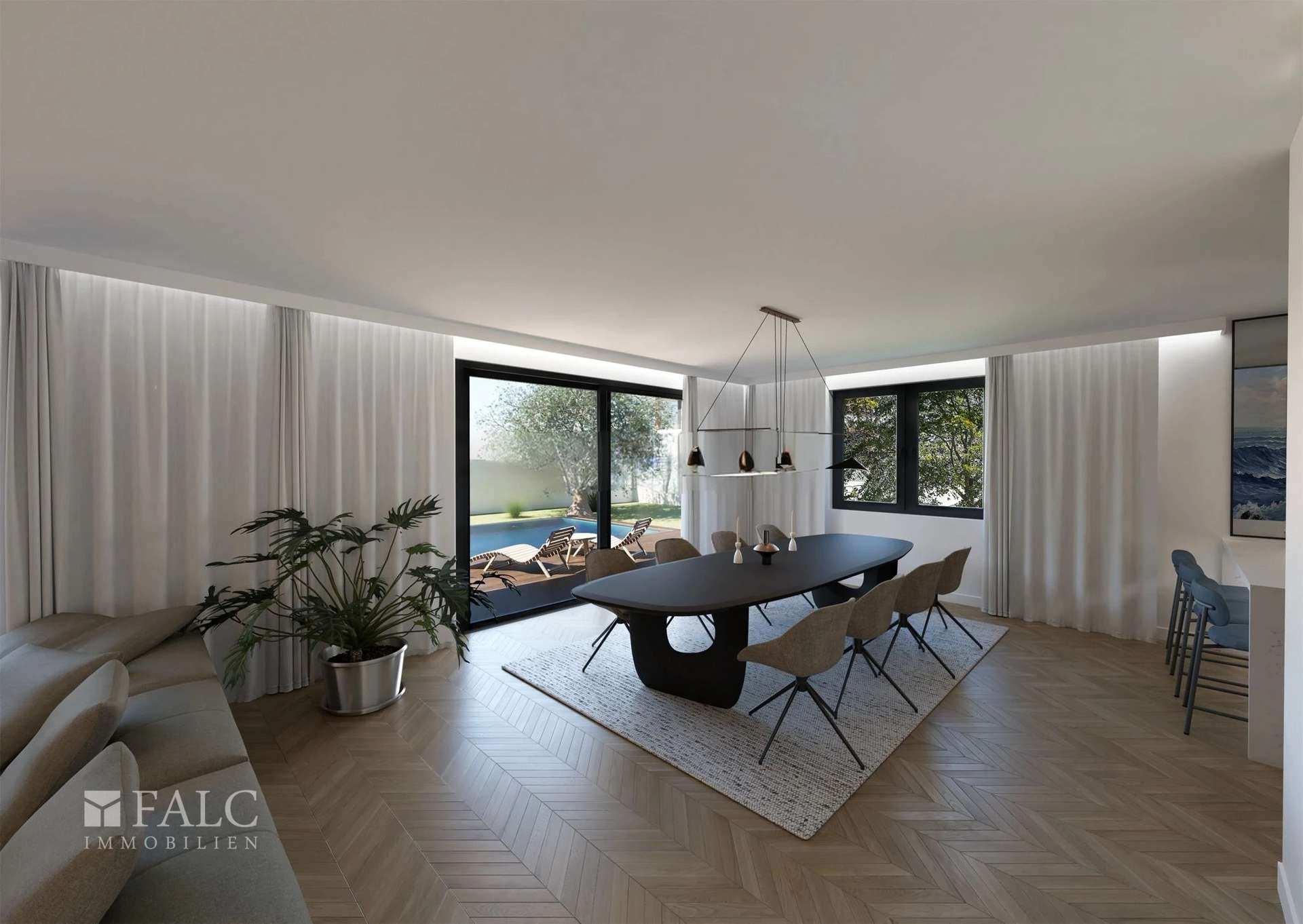 Erdgeschoss: Das Erdgeschoss besticht durch einen offen gestalteten Wohn- und Essbereich mit viel Tageslicht sowie eine moderne, voll ausgestattete Küche. Große Glasflächen ermöglichen einen direkten Zugang zur überdachten Terrasse und zum gepflegten Garten mit privatem Pool – ein idealer Ort für Entspannung und gesellige Stunden. Ergänzt wird diese Ebene durch einen praktischen Abstellraum, ein Gäste-WC sowie eine stilvolle Sommerküche, die zu gemütlichen Abenden im Freien einlädt.