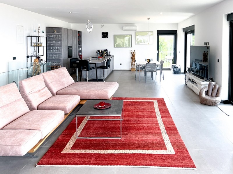Obergeschoss: Wohnzimmer mit Küche und Essbereich, Terrasse