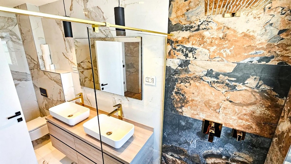 Die Villa verfügt über fünf Schlafzimmer mit jeweils eigenem Bad, einen Arbeitsraum, einen Wellnessbereich, einen Weinkeller sowie einen offenen Wohn- und Kochbereich mit Essbereich und Zugang zu mehreren Terrassen.