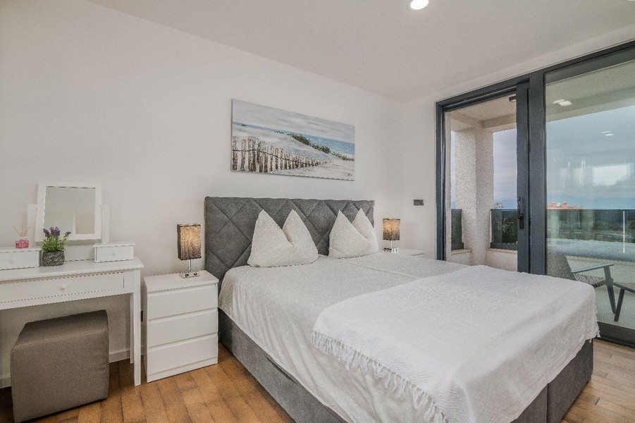 Bei diesem Objekt handelt es sich um eine moderne, stilvolle Villa mit Swimmingpool und Meerblick in Malinska, Insel Krk (mit Brückenverbindung zum Festland).
