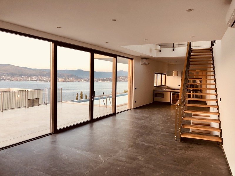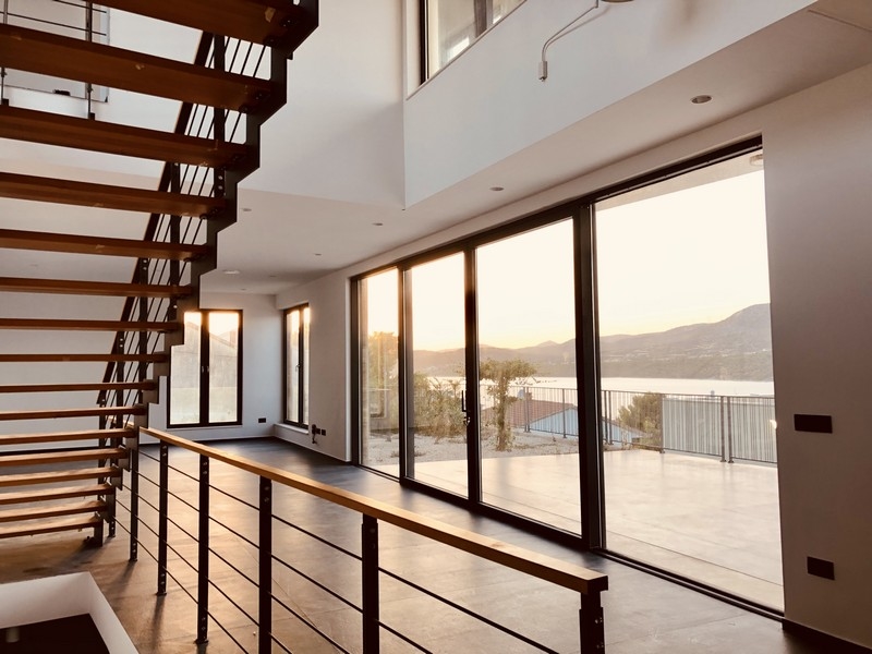 Besonders von den oberen Schlafzimmern bietet sich durch die großen Glasfronten ein spektakulärer Blick auf die Terrasse, den Pool, das Meer und die malerische Küstenlinie des Festlands.