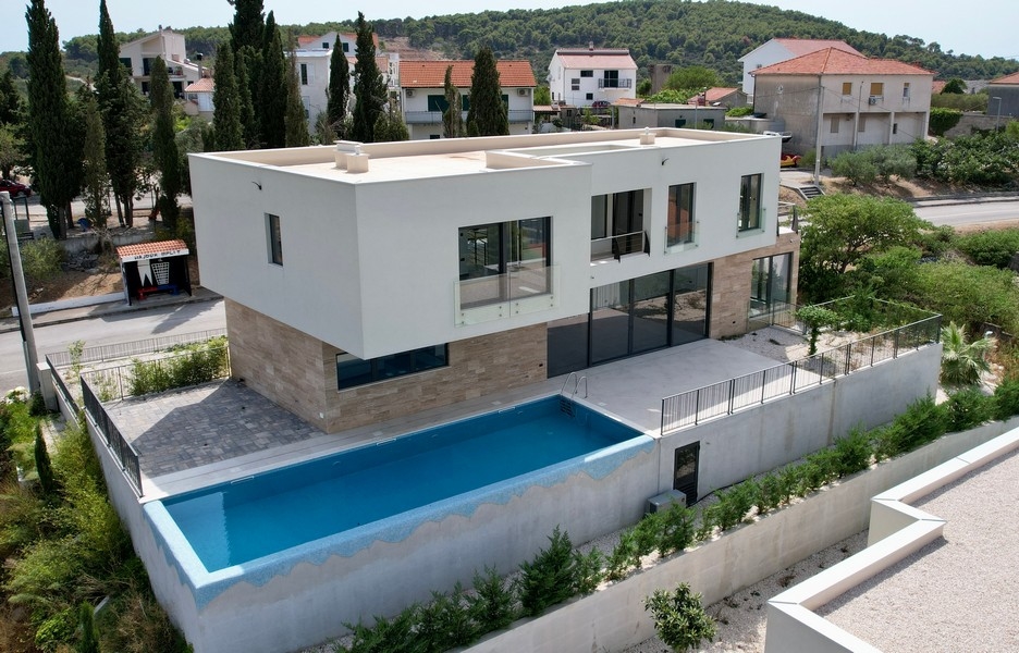 Bei diesem Angebot handelt es sich um eine außergewöhnliche Luxusvilla in nahe dem Meeresufer auf der Insel Ciovo in Dalmatien. Ciovo ist über zwei Brücken mit dem Festland verbunden. In nur ca. 15 Kilometern Entfernung zum int. Flughafen Split befindet sich diese State-of-the-Art Villa in wunderschöner Lage mit Panorama-Meerblick.