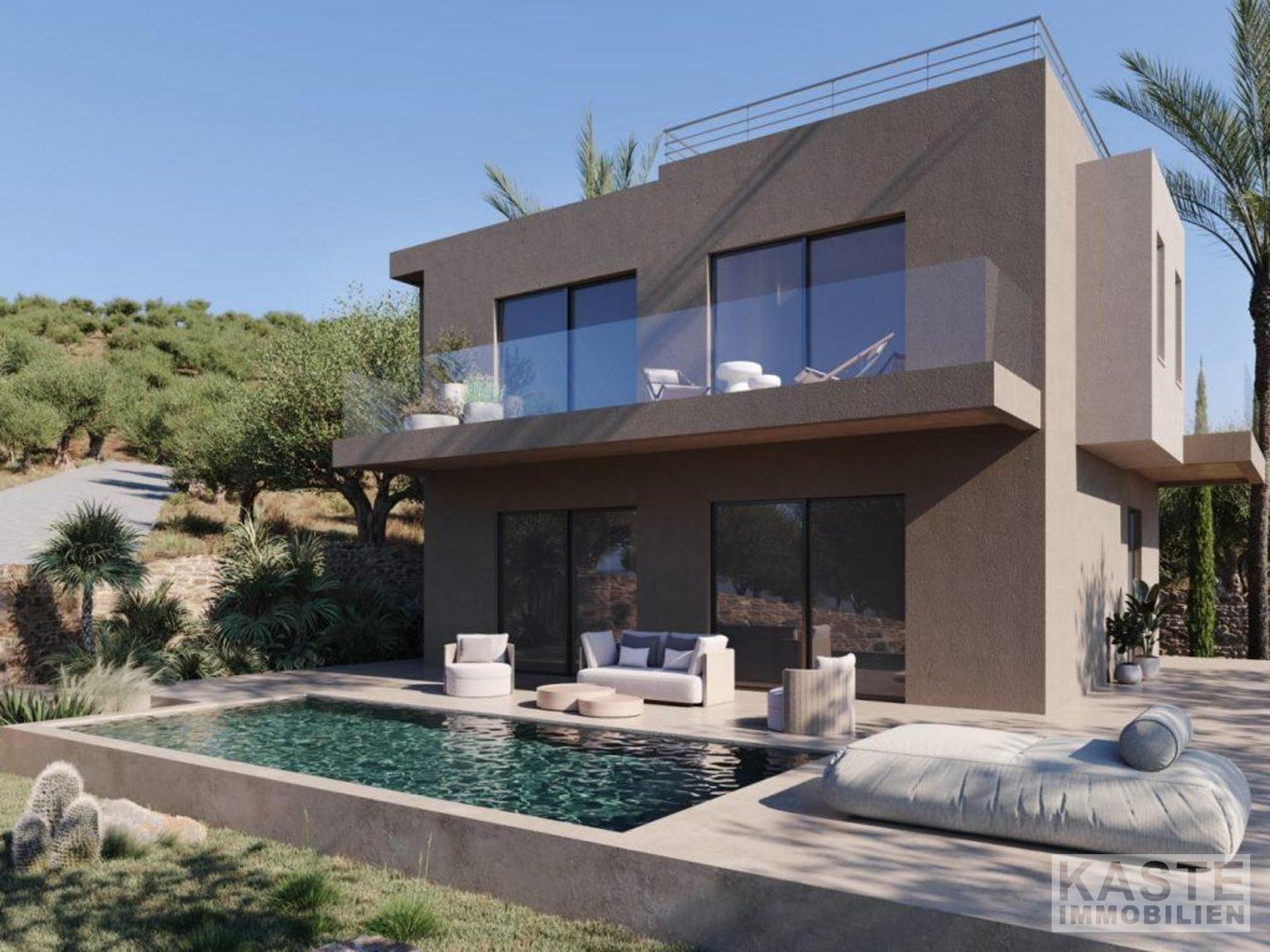 Die Villa besticht durch moderne Architektur und verarbeitet erstklassige Materialien, darunter griechischer Marmor in den Wohnräumen. Die Schlafzimmer sind zusätzlich mit hochwertigen Eichenholz- oder Fliesenböden ausgestattet, wodurch ein warmes und einladendes Ambiente geschaffen wird.