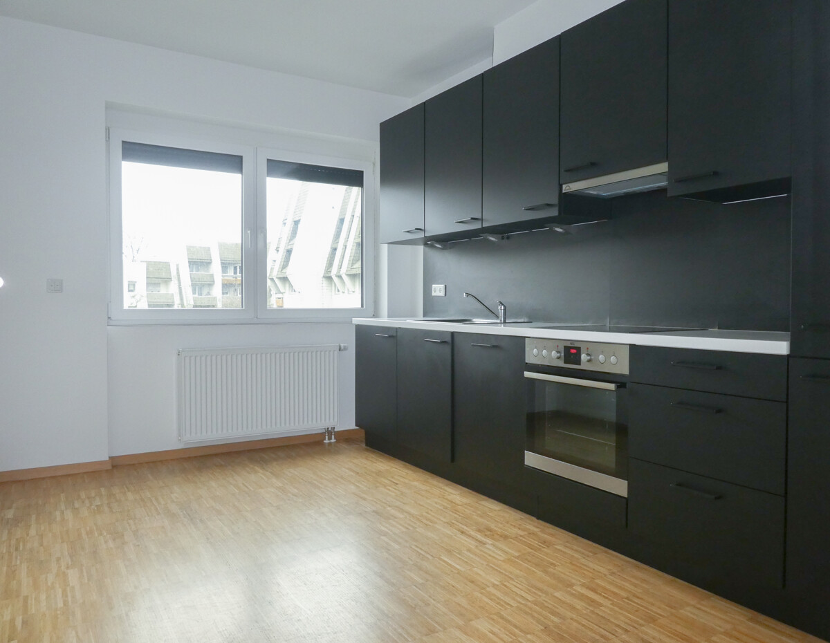 Die Küche ist separat gehalten und mit einer modernen, dunklen Einbauzeile inklusive Backofen und Kochfeld ausgestattet. Hier lässt sich der Familienalltag praktisch organisieren, mit ausreichend Arbeitsfläche und Stauraum.