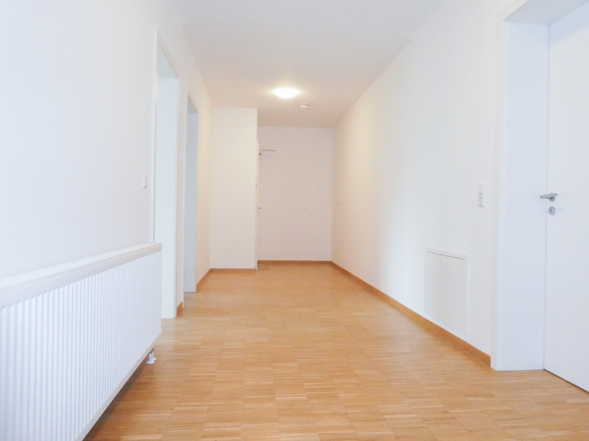 Vom Eingangsbereich aus gelangen Sie in einen großzügigen Flur, der als zentrale Verbindung zu den Räumen dient und Platz für Garderobe und Stauraum bietet. Die Wohnung wirkt insgesamt freundlich und lichtdurchflutet, mit großen Fenstern und einem durchgängigen, warm wirkenden Bodenbelag in den Wohnräumen.
