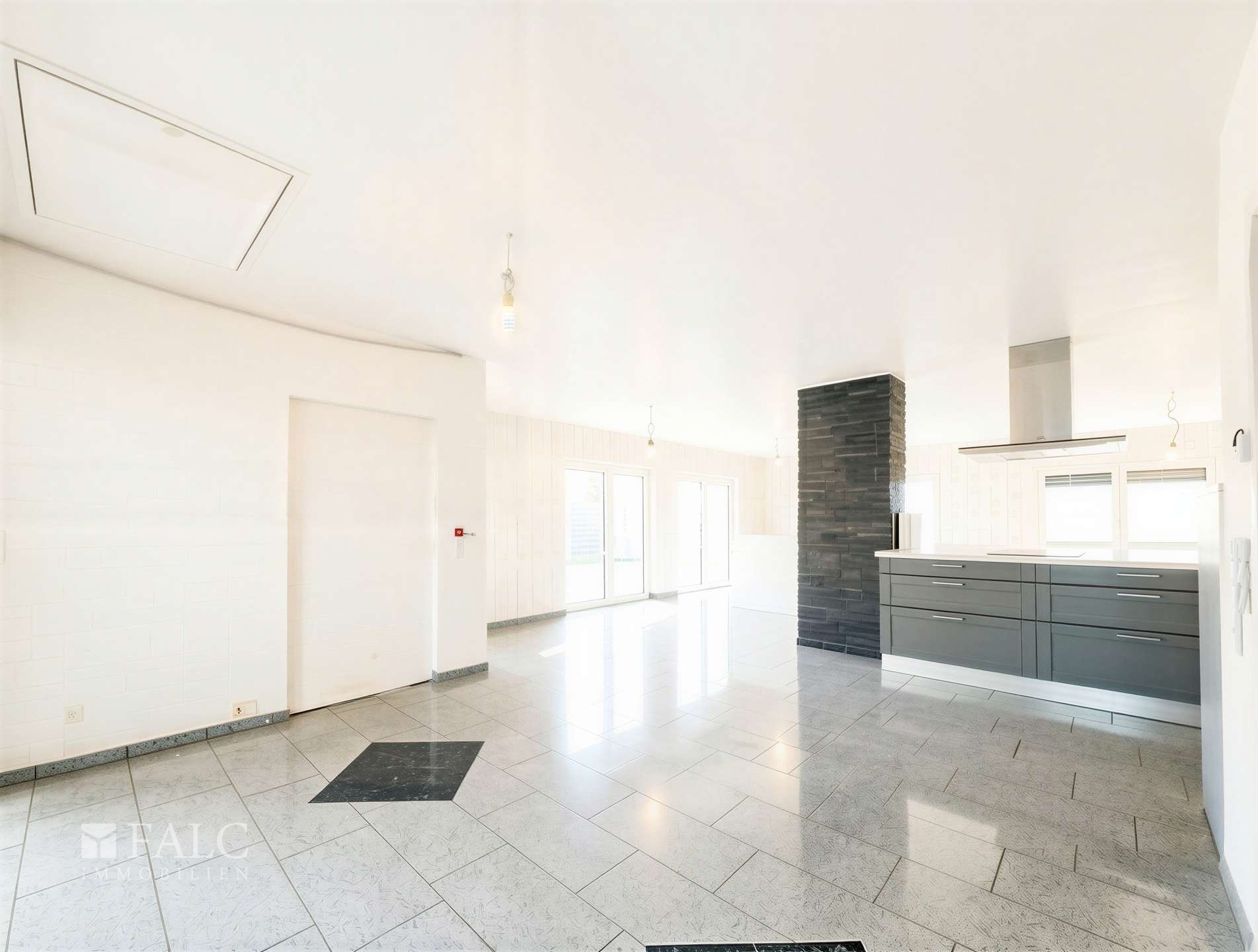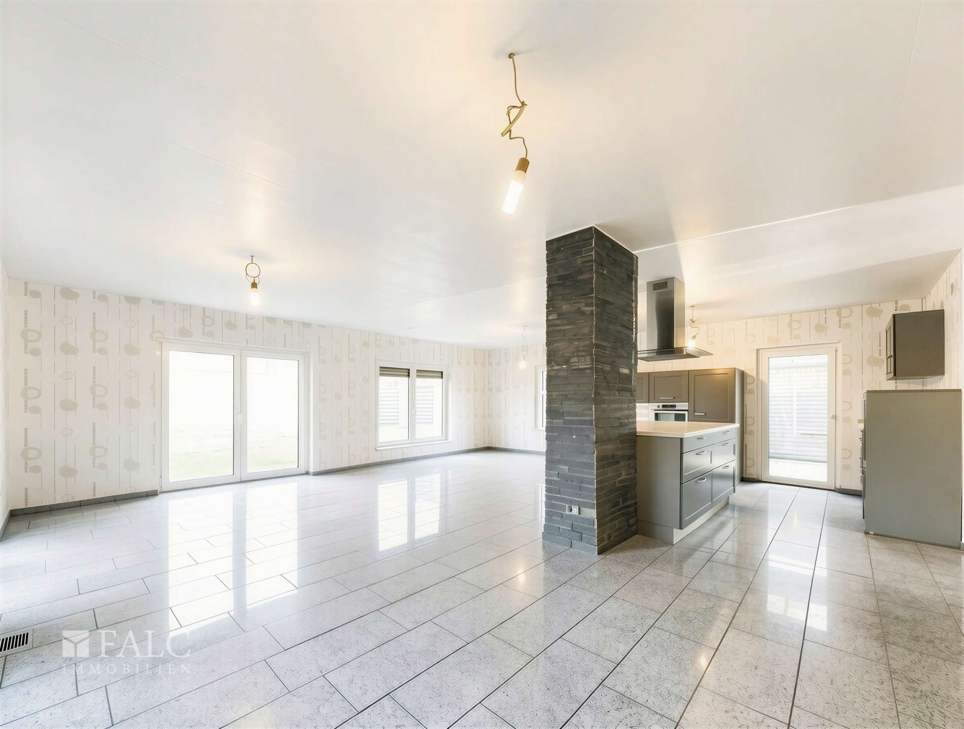 Geradeaus durch den Flur öffnet sich der zentrale Wohnbereich des Hauses. Hier befindet sich ein großzügiges Wohnzimmer mit offener Küche, das durch große Fensterfronten besonders lichtdurchflutet ist und eine angenehme Wohnatmosphäre schafft. Von hier aus besteht ein direkter Zugang zur Terrasse und in den weitläufigen Garten, der vielfältige Nutzungsmöglichkeiten für Erholung, Freizeit oder Familienaktivitäten bietet.