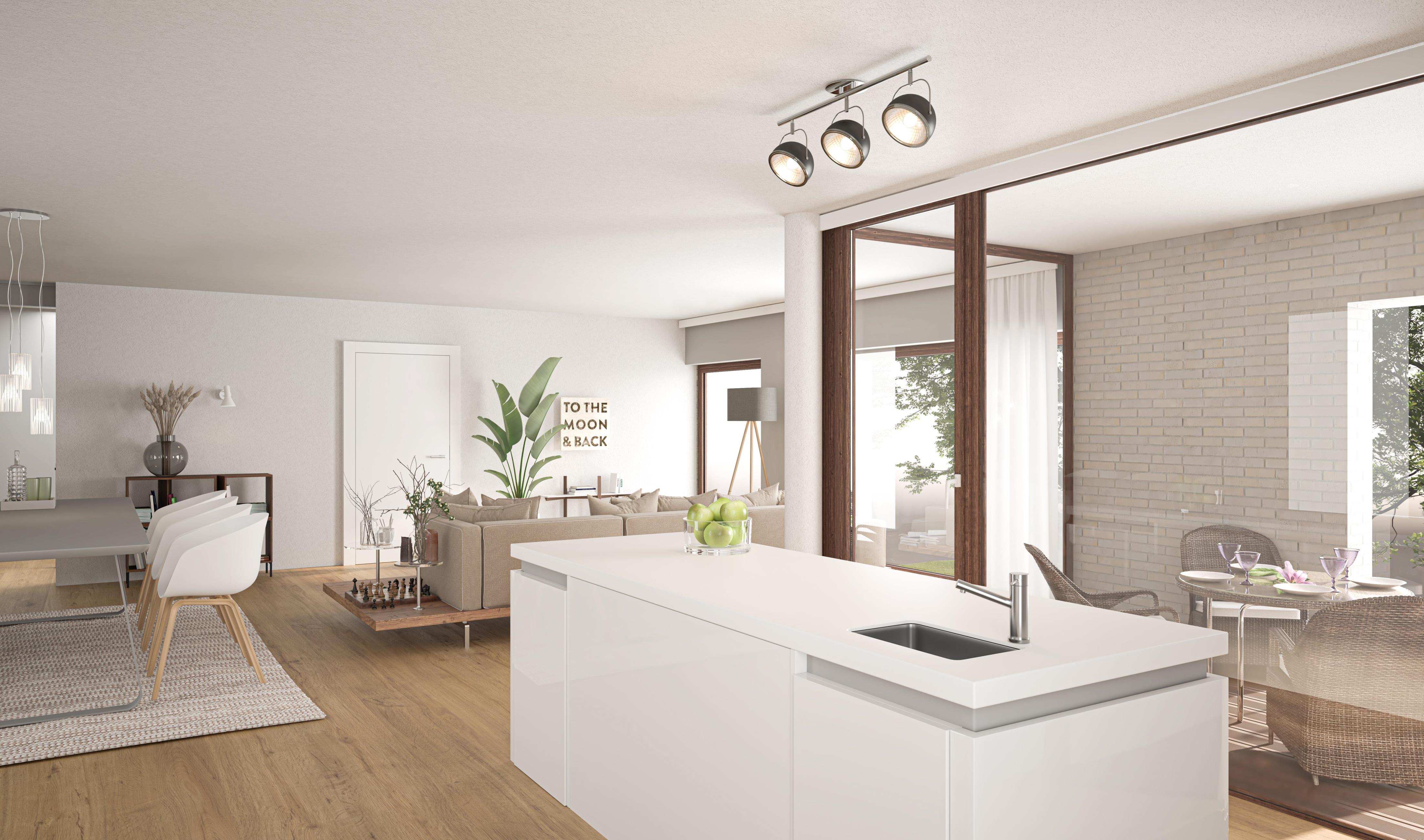 Alle Wohnungen verfügen über großzügig geschnittene Wohn- und Essbereiche, die dank großer Fensterflächen und einer dreifachen Wärmeschutzverglasung lichtdurchflutet sind und ein angenehmes Raumgefühl vermitteln. Die Loggien, die jeder Wohnung zugeordnet sind, erweitern den Wohnraum nach draußen und schaffen eine ruhige Rückzugsmöglichkeit für entspannte Stunden im Freien. Vinylboden in frei wählbarer Ausführung sorgt für eine individuelle Gestaltung. Jede Einheit ist mit einem separaten Hauswirtschaftsraum ausgestattet, der einen Waschmaschinenanschluss bietet und für zusätzliche Ordnung sowie Funktionalität im Alltag sorgt.