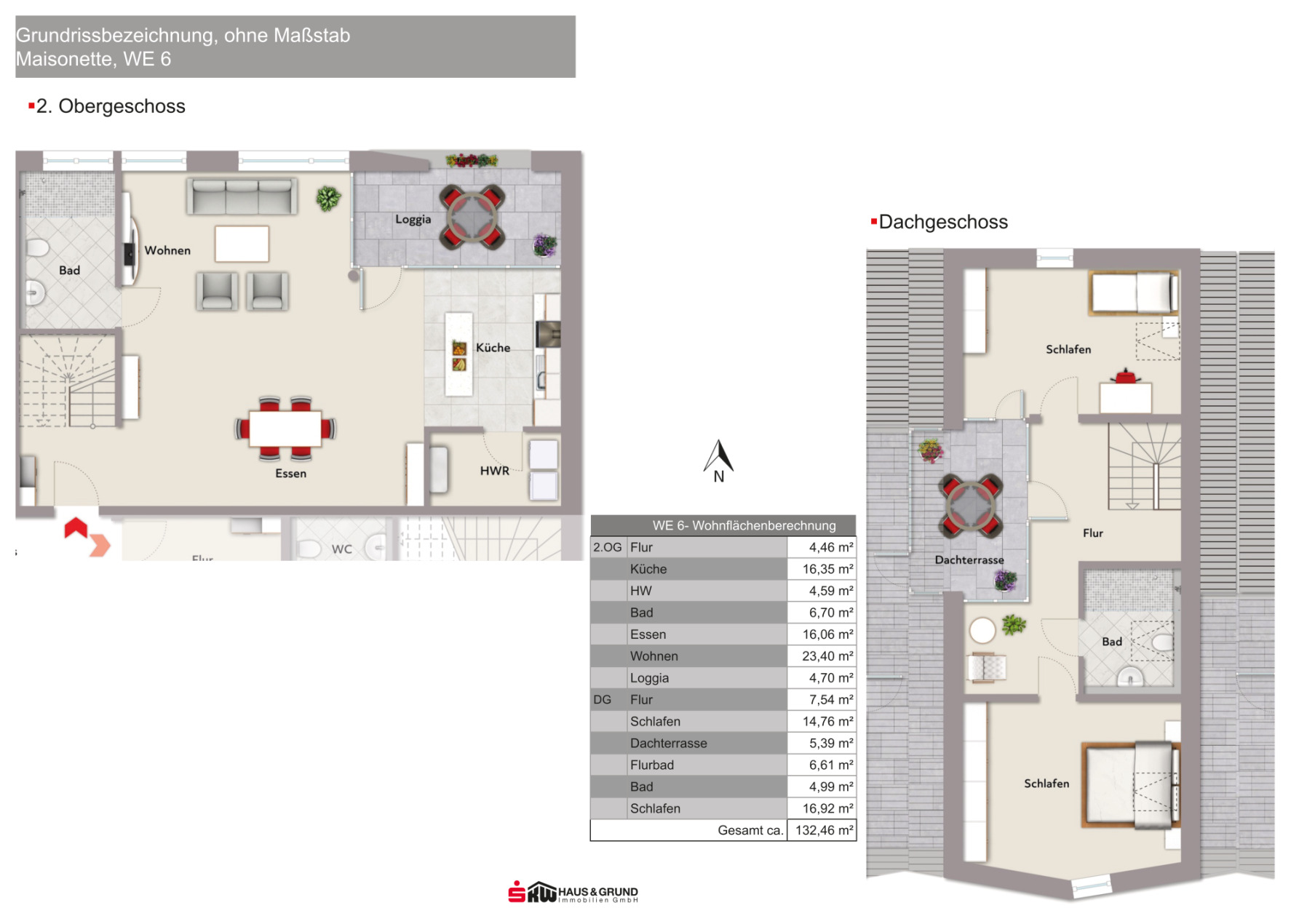 Ein besonderes Highlight des Projekts sind die drei Maisonette-Wohnungen, die sich über das zweite Obergeschoss bis ins Dachgeschoss erstrecken. Diese bieten ein Raumkonzept über zwei Ebenen, das offene Wohnen mit Privatsphäre vereint. Die untere Ebene umfasst einen großzügigen Wohn- und Essbereich mit offener Küche und direktem Zugang zur Loggia. Im Dachgeschoss sind zwei Schlafzimmer, ein weiteres Badezimmer sowie sonnige Dachterrassen untergebracht, die den Maisonette-Wohnungen eine exklusive Wohnqualität verleihen. Auf Wunsch kann im Bereich der Treppen innerhalb der Wohnung ein kleiner Lift eingebaut werden. Gerne stellen wir hierzu weitere Informationen zur Verfügung.