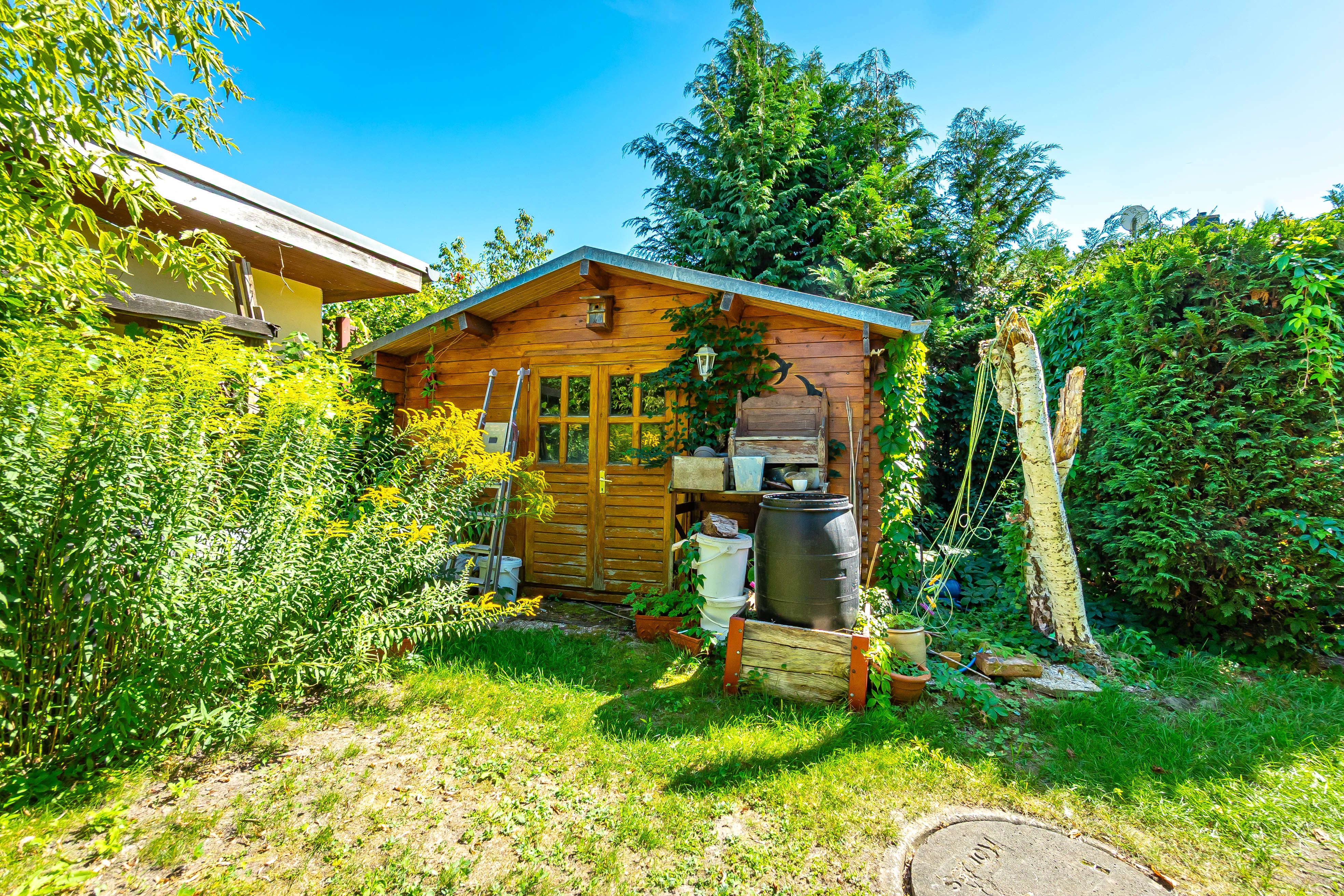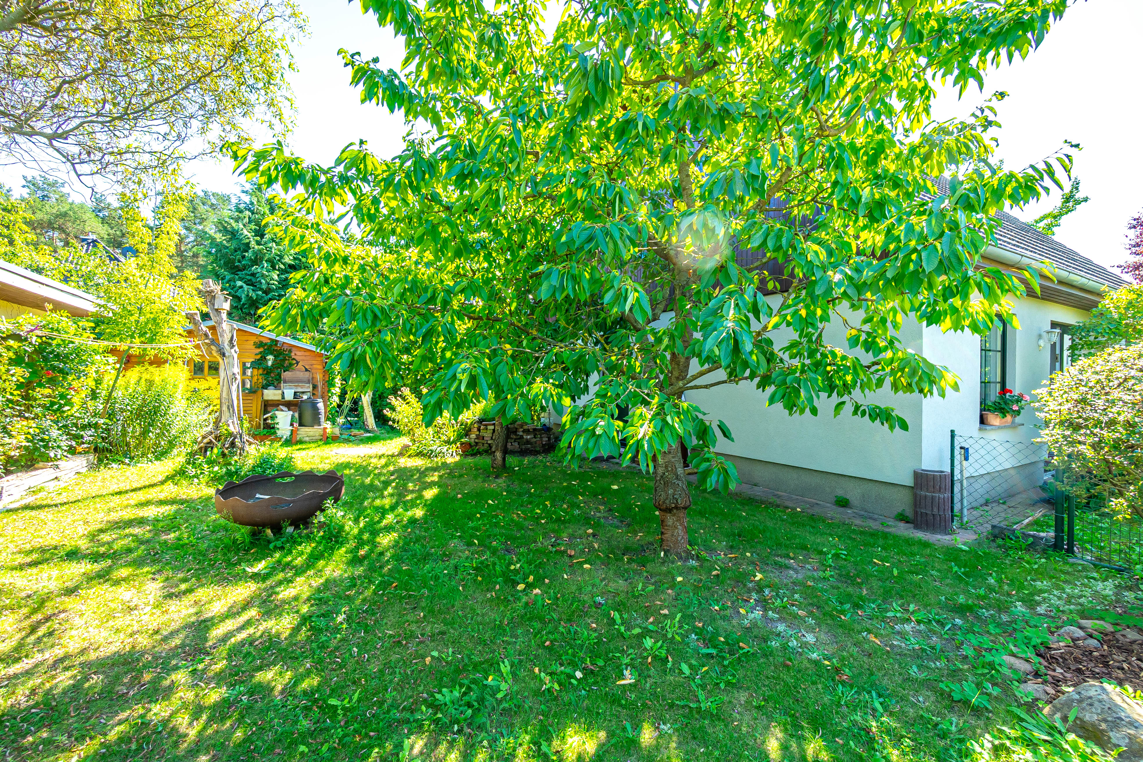 Außenanlage • Eingewachsener Garten mit viel Grün • Rasenflächen & Obstbaum (z. B. Kirsche) • Terrasse mit Pflastersteinbelag • Holz-Gartenschuppen für Geräte/Material • Grundstück vollständig eingefriedet • Blumenbeete, Sträucher, Hecken – sehr privat • Naturwiesen gegenüber, Mellensee fußläufig erreichbar