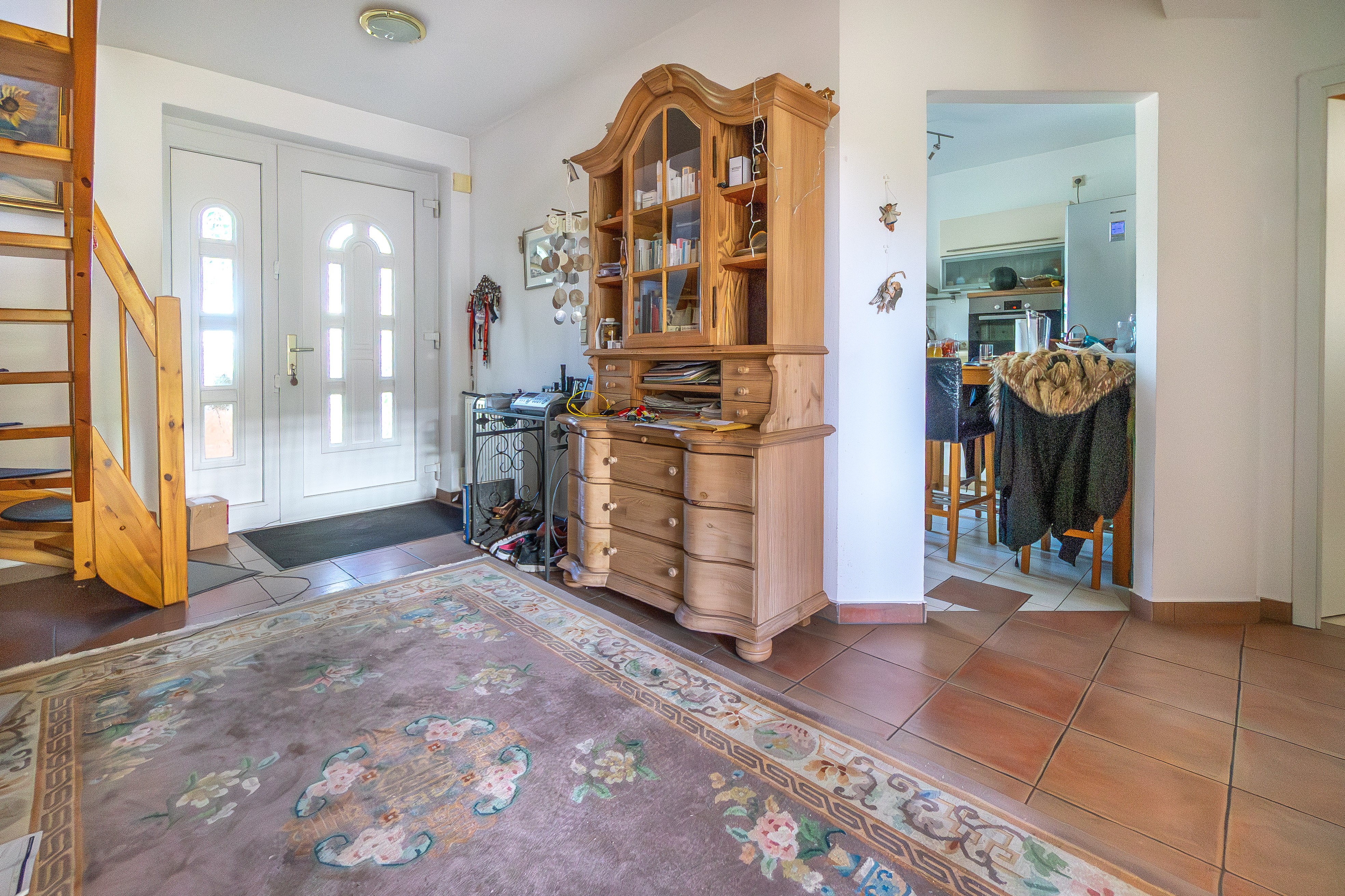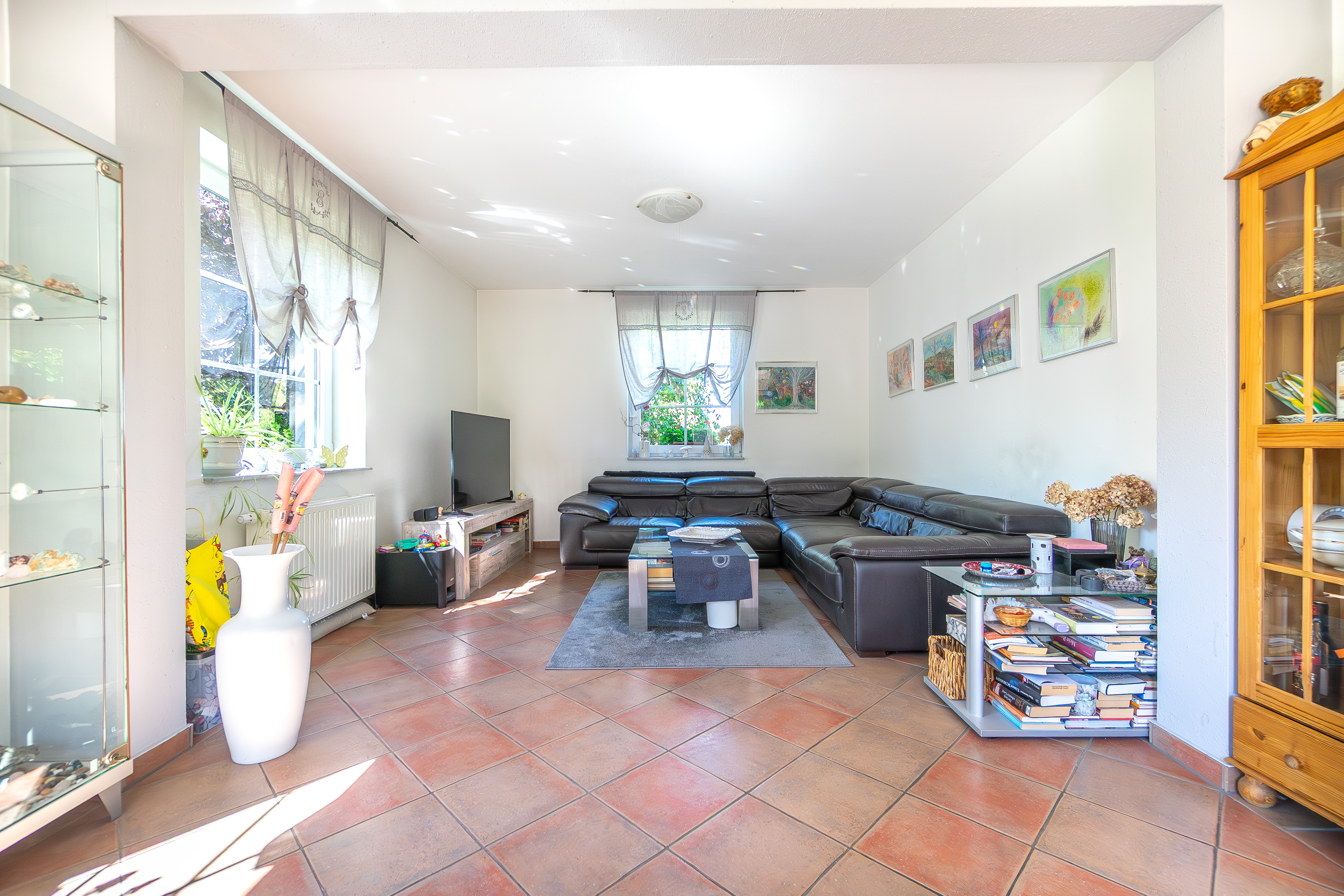 Im Erdgeschoss empfängt eine Diele, von der aus sich die Wohnbereiche erschließen. Das Wohn- und Esszimmer ist großzügig geschnitten und durch die Fensterfront sowie den Zugang zur Terrasse angenehm hell. Der Raum bietet Platz für Wohnen, Essen und gesellige Stunden. Terrakottafliesen im Erdgeschoss unterstützen die pflegeleichte Nutzung. Die Einbauküche verfügt über einen praktischen Sitzbereich sowie Fenster und ist direkt an den Hauswirtschaftsraum angebunden. Hier befindet sich die Gaszentralheizung (Baujahr 2001) sowie ein weiterer Ausgang in den Garten. Ergänzt wird das Erdgeschoss durch ein Gäste-WC mit Waschbecken und Stellmöglichkeit für Waschmaschine und Trockner. Eine offene Holztreppe führt in das Dachgeschoss.
