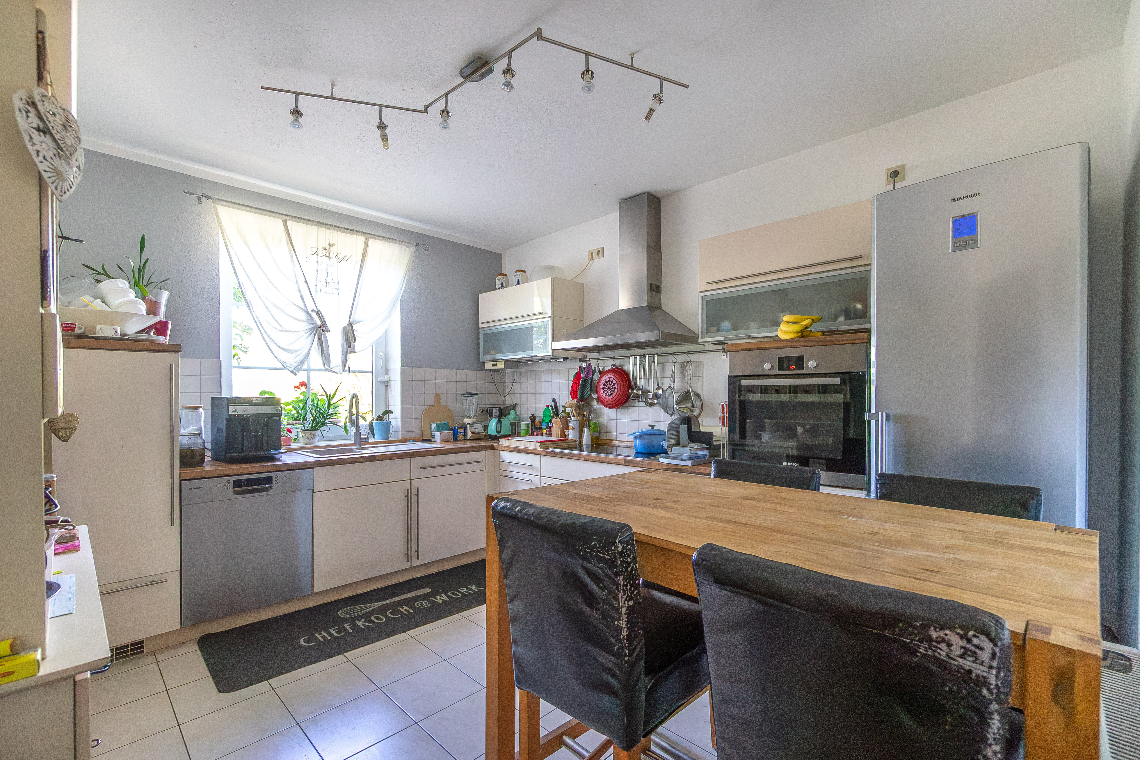 Ausstattung: • Kamin im Wohnbereich • Helle Fliesen im EG & Bad • Laminat im DG (Schlaf-/Kinder-/Büro) • Einbauküche inklusive Geräte • Großzügige Badewanne + separate Duschkabine • Große Fensterflächen, teilweise bodentief • Gute Raumaufteilung für Familie & Büroarbeit