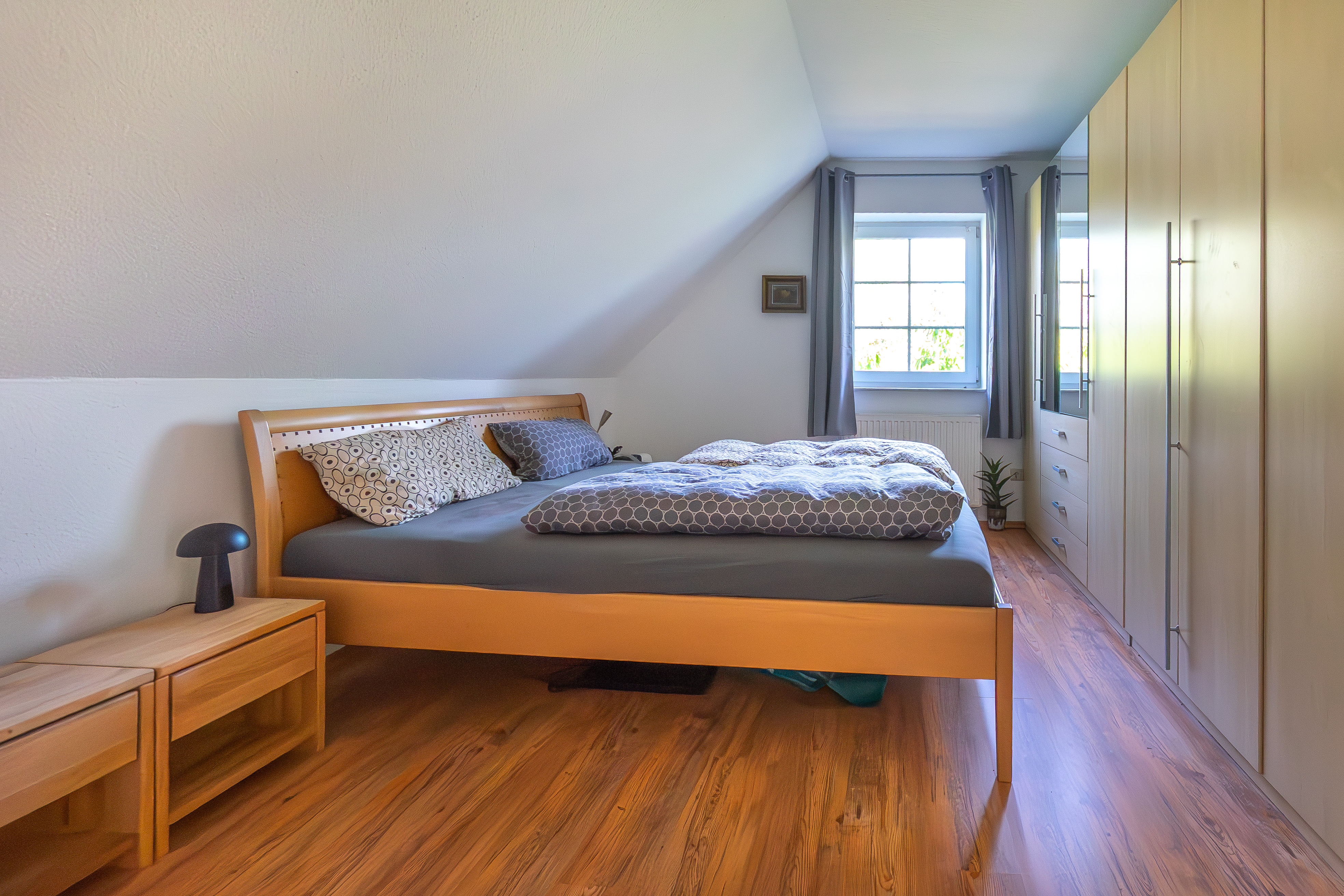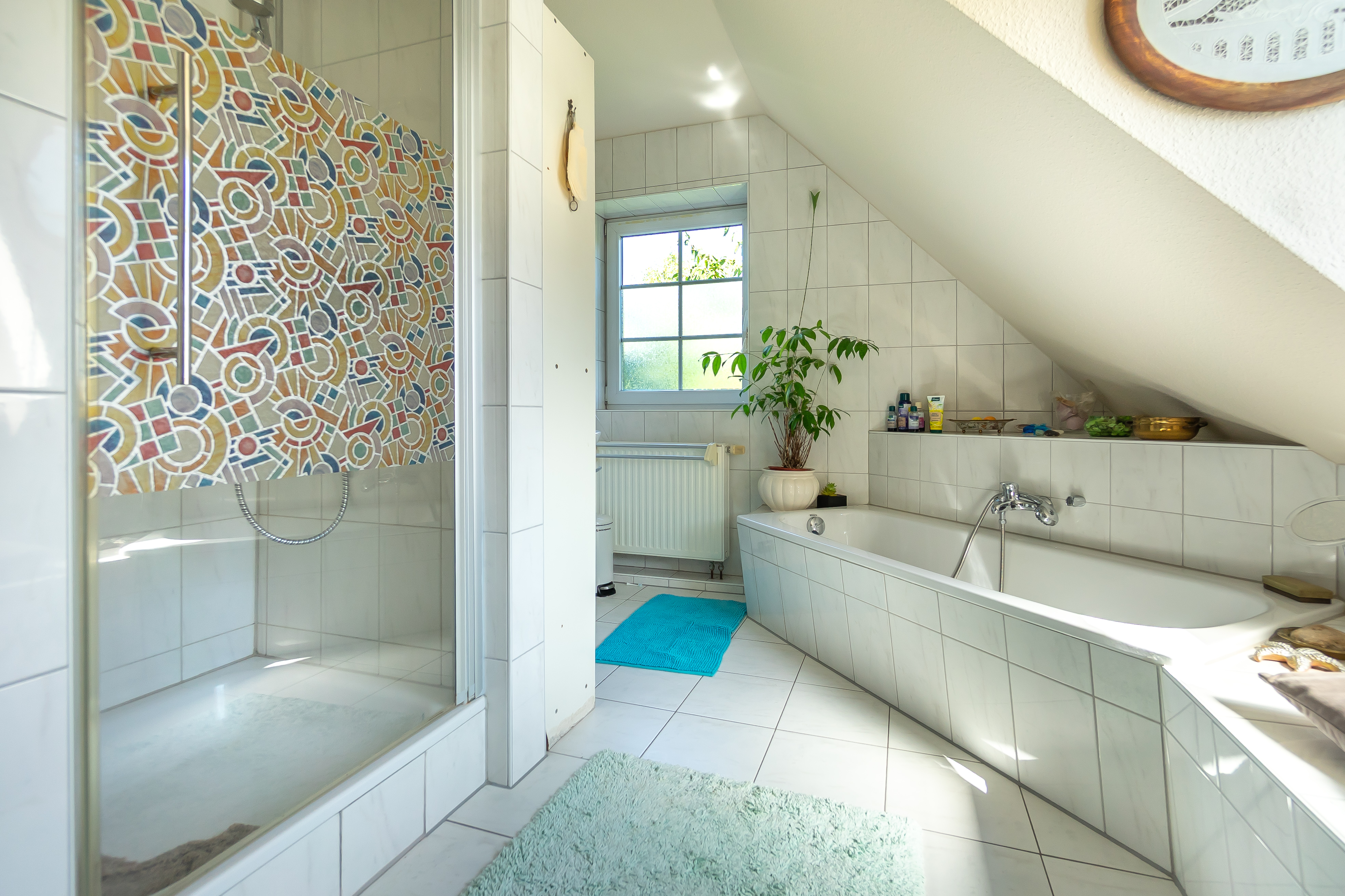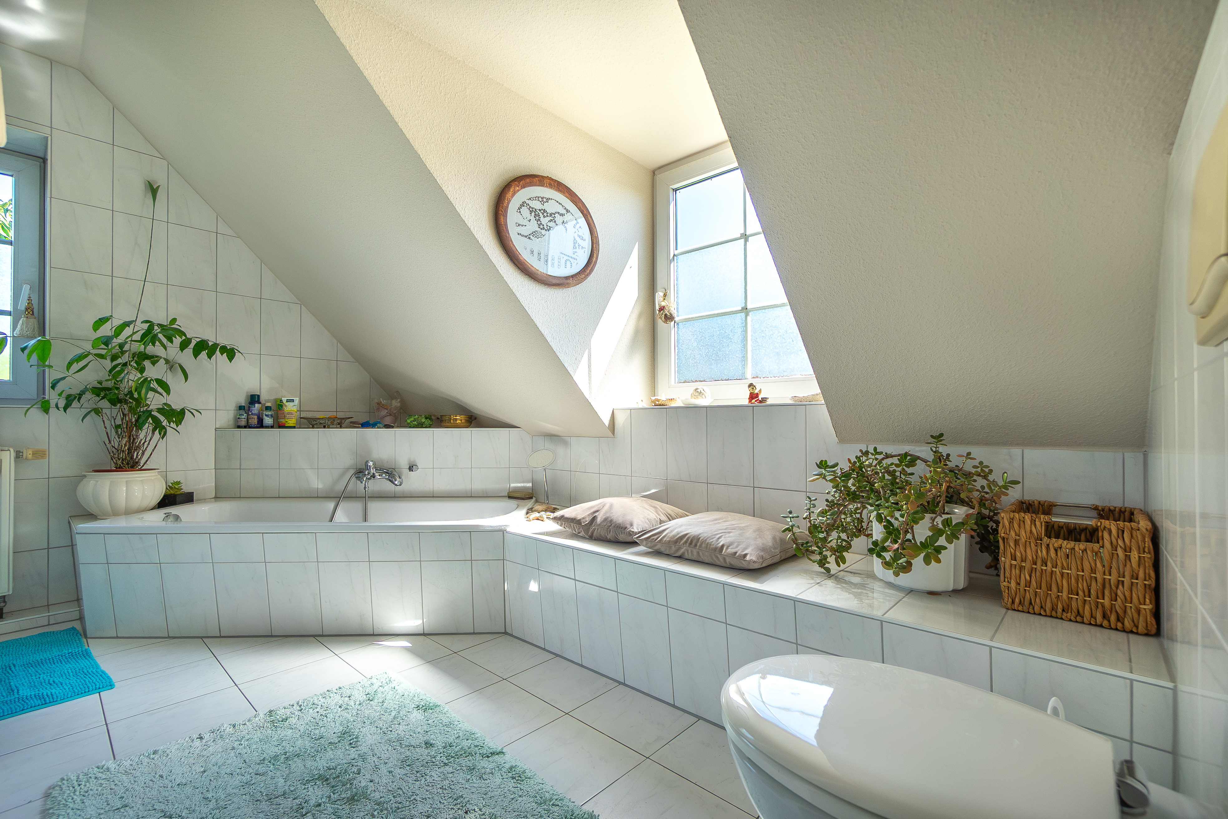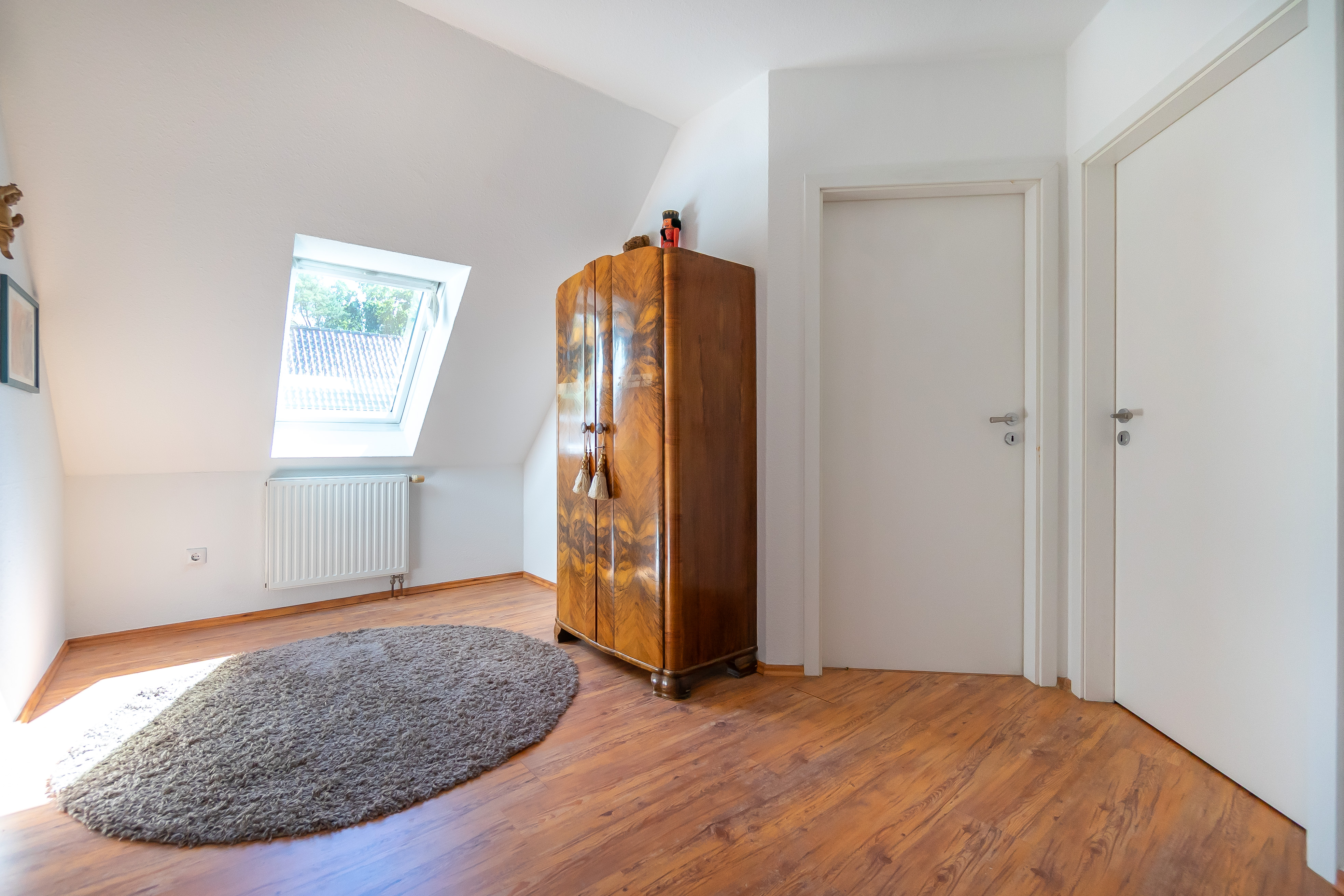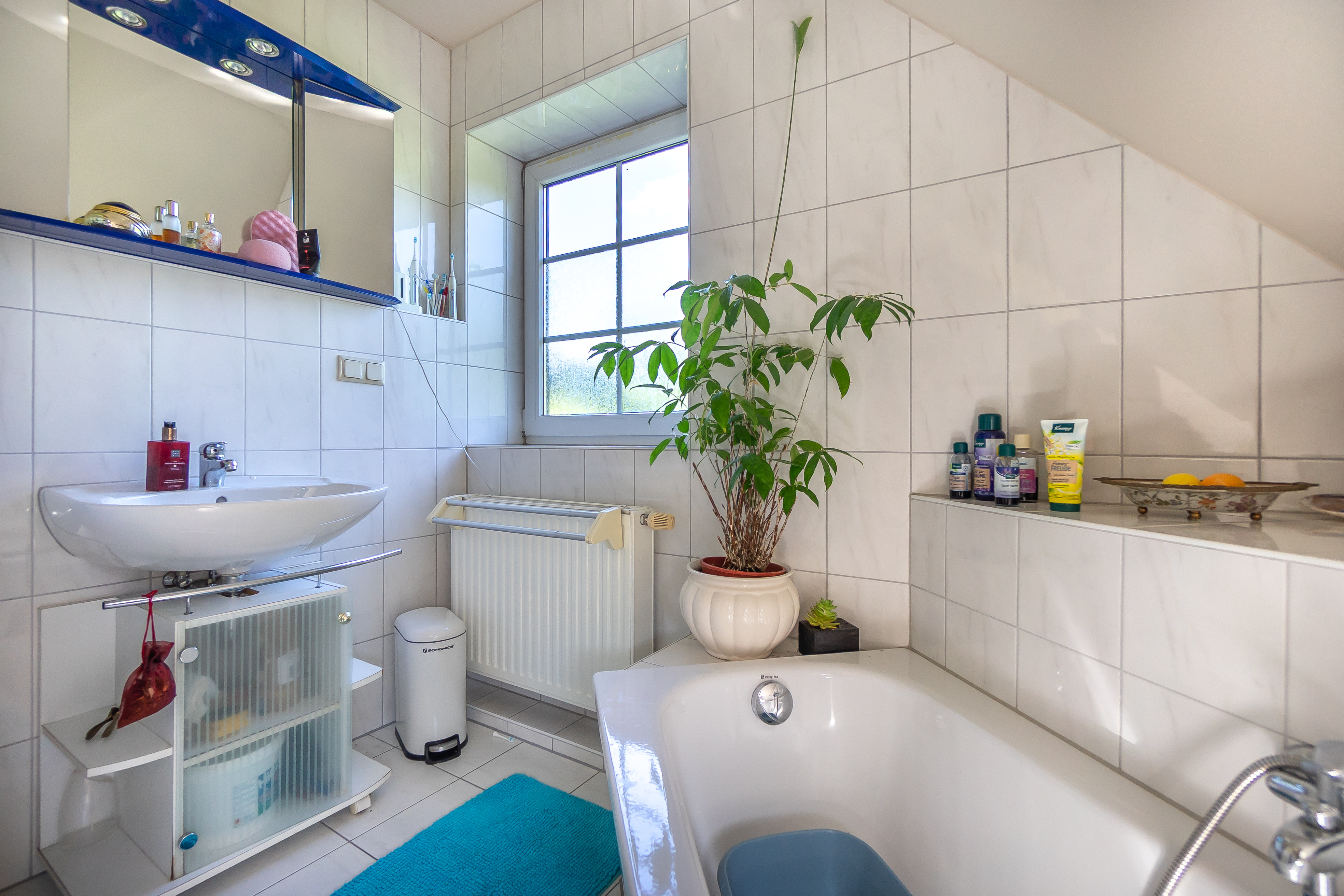 Das Dachgeschoss bietet eine helle Galerie mit Dachfenster, die sich als kleine Arbeitsecke oder Leseplatz eignet. Drei Zimmer stehen hier zur Verfügung – nutzbar als Schlafzimmer, Kinderzimmer, Gäste- oder Arbeitsraum. Dachschrägen schaffen ein wohnliches Ambiente, ohne den Raum zu sehr einzuschränken. Das großzügige Bad ist mit Badewanne und separater Dusche ausgestattet und wird durch helle Fliesen und zwei Fenster gut belichtet und belüftet.