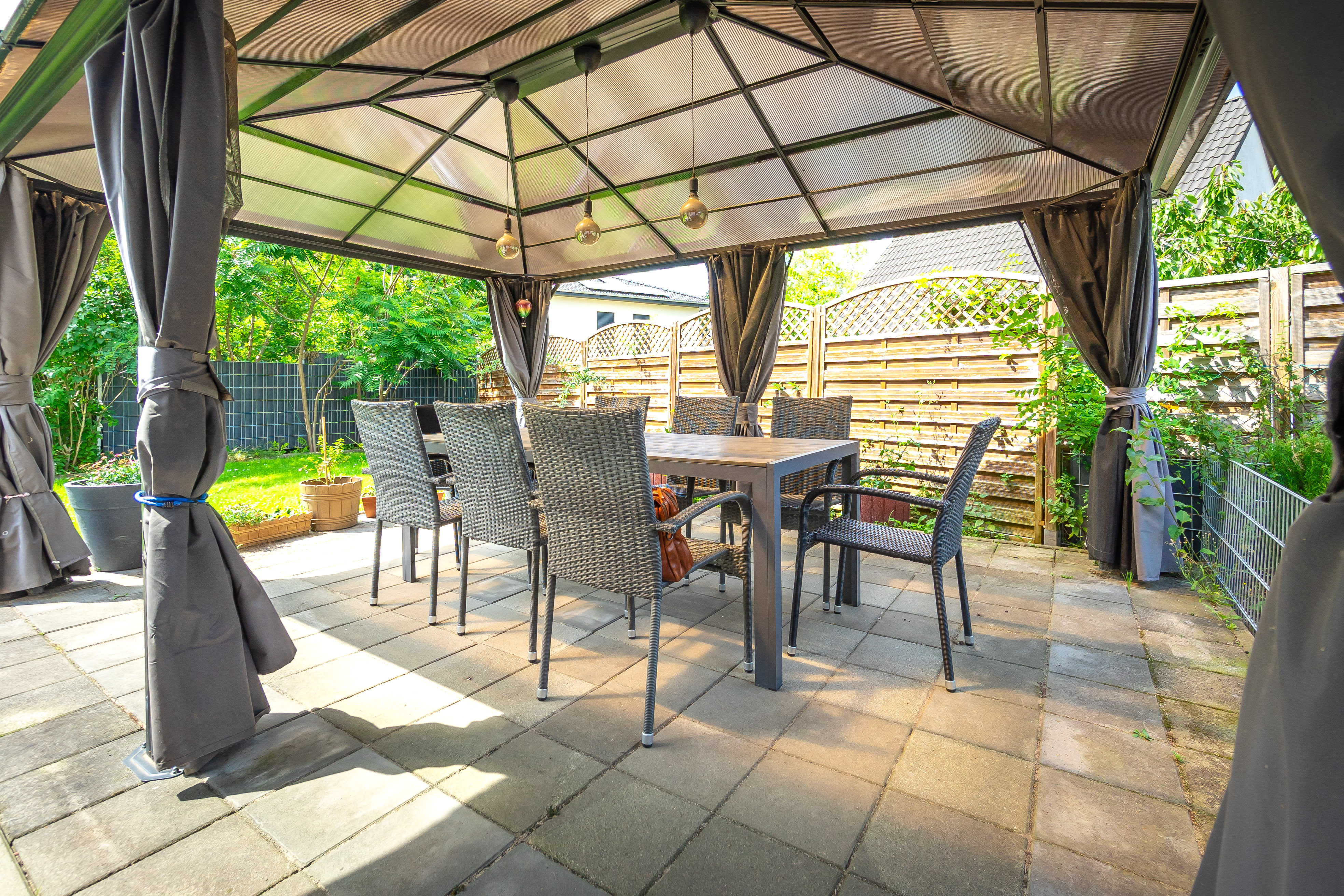 Der Außenbereich des Hauses ist gepflegt und vielseitig nutzbar. Zwei Pavillons schaffen geschützte Sitzbereiche im Garten. Eine Fertiggarage mit Schwingtor, ein Gerätehaus, ein Schuppen mit Brunnenpumpe sowie ein überdachter Fahrradabstellplatz ergänzen das Angebot.