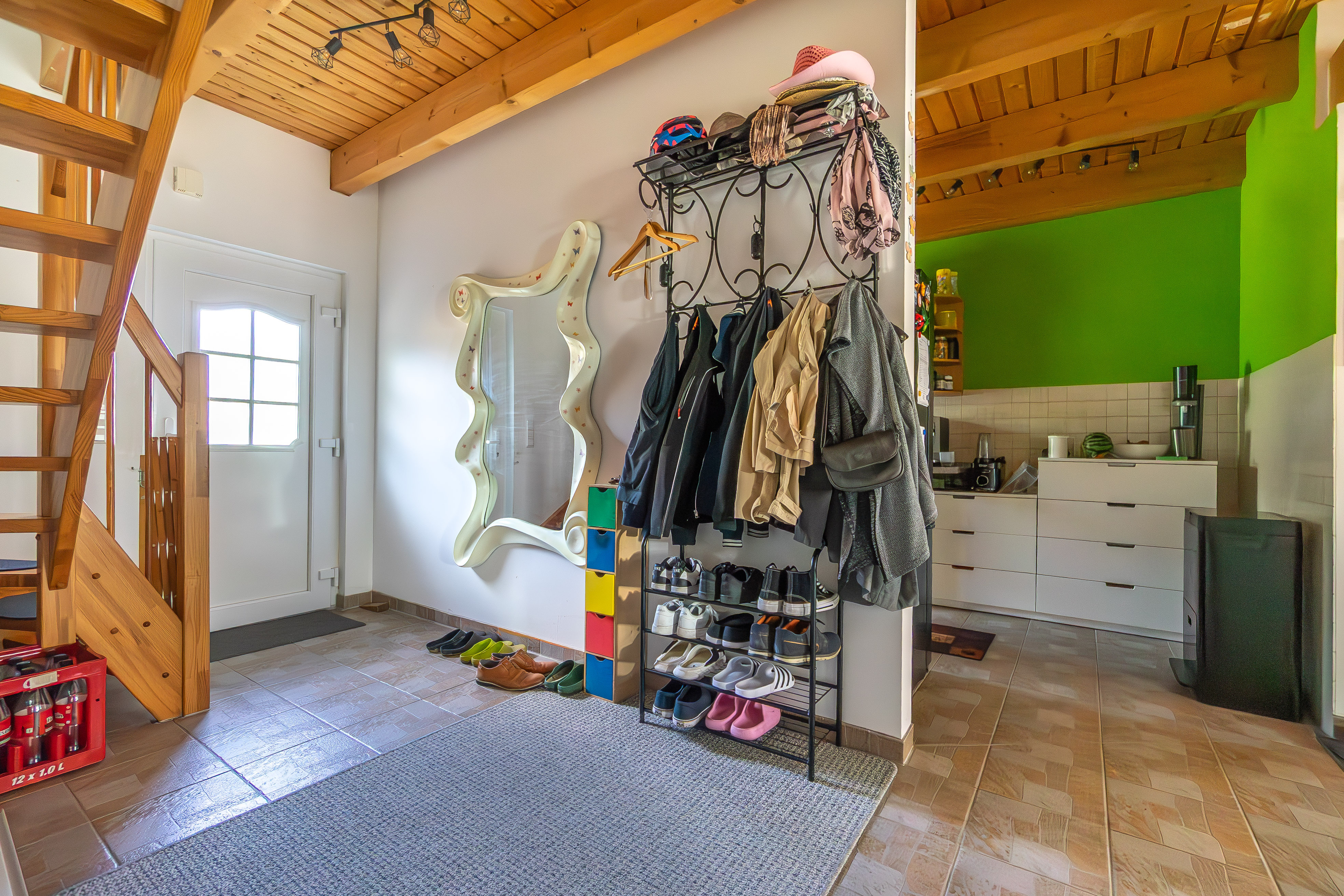 Im Erdgeschoss empfängt eine offen gestaltete Diele, die direkt in den großzügigen Wohn- und Essbereich übergeht. Die offene Küche ist mit einer Einbauküche ausgestattet und in das Raumkonzept integriert – ideal für gemeinsames Kochen und Beisammensein. Vom Wohnzimmer aus gelangt man in den hellen Wintergarten, der sich zur Süd-Ostseite hin öffnet und einen geschützten Blick in den Garten ermöglicht. Die gesamte Etage ist gefliest und wird über eine Fußbodenheizung beheizt. Ergänzt wird das Erdgeschoss durch ein Duschbad mit WC und Waschbecken sowie einen Hauswirtschaftsraum mit Anschluss für Waschmaschine und Trockner.