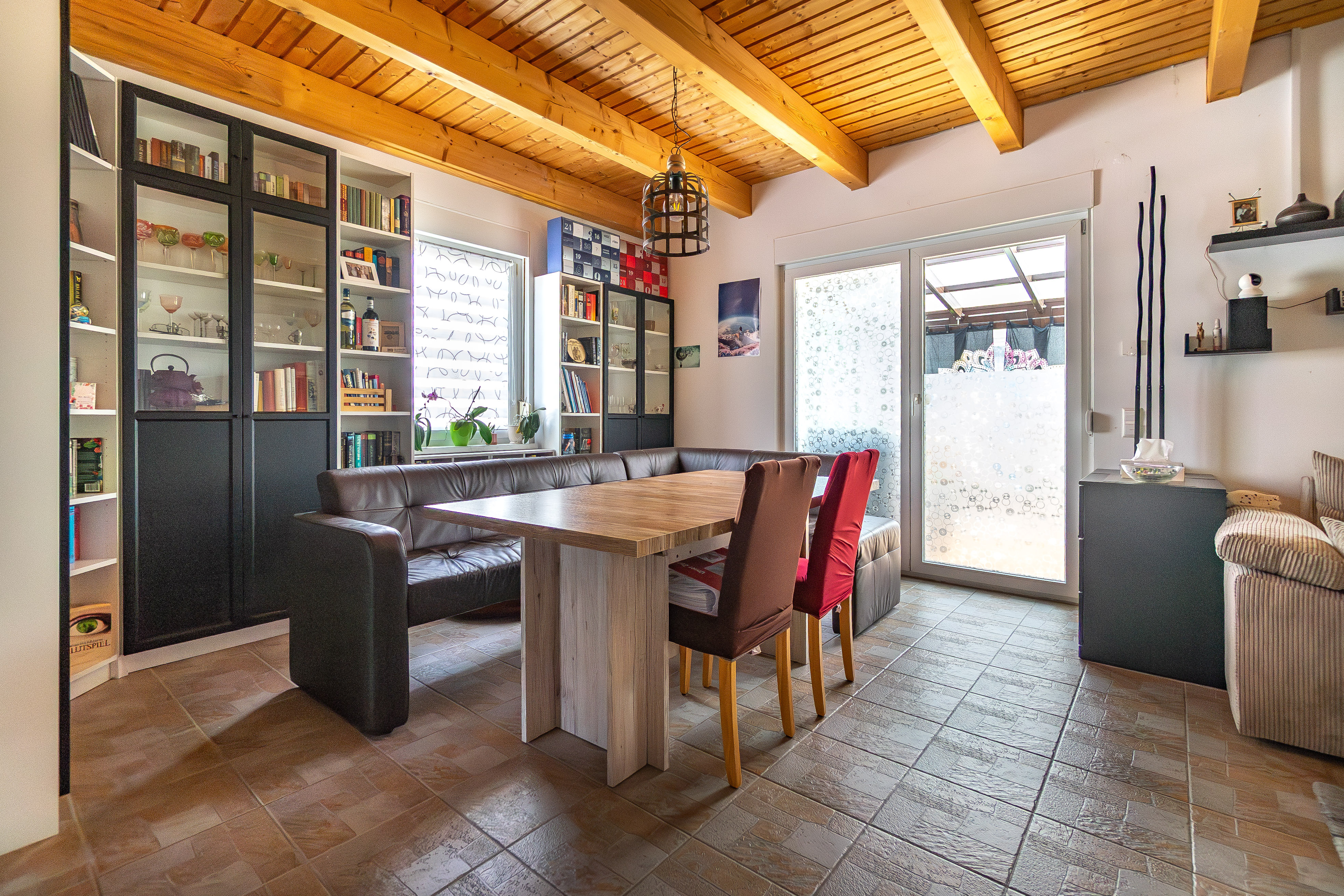 Erdgeschoss (EG): • offen gestaltete Eingangsdiele • Boden gefliest → Fußbodenheizung • offene Küche mit EBK (Einbauküche) • großes Wohn-/Esszimmer mit Zugang zum Wintergarten • großzügiger Wintergarten zur Süd-Ostseite (Baujahr 2014) • gefliestes Duschbad mit WC und Waschbecken (renoviert 2014) • HWR mit Waschmaschinenstellplatz