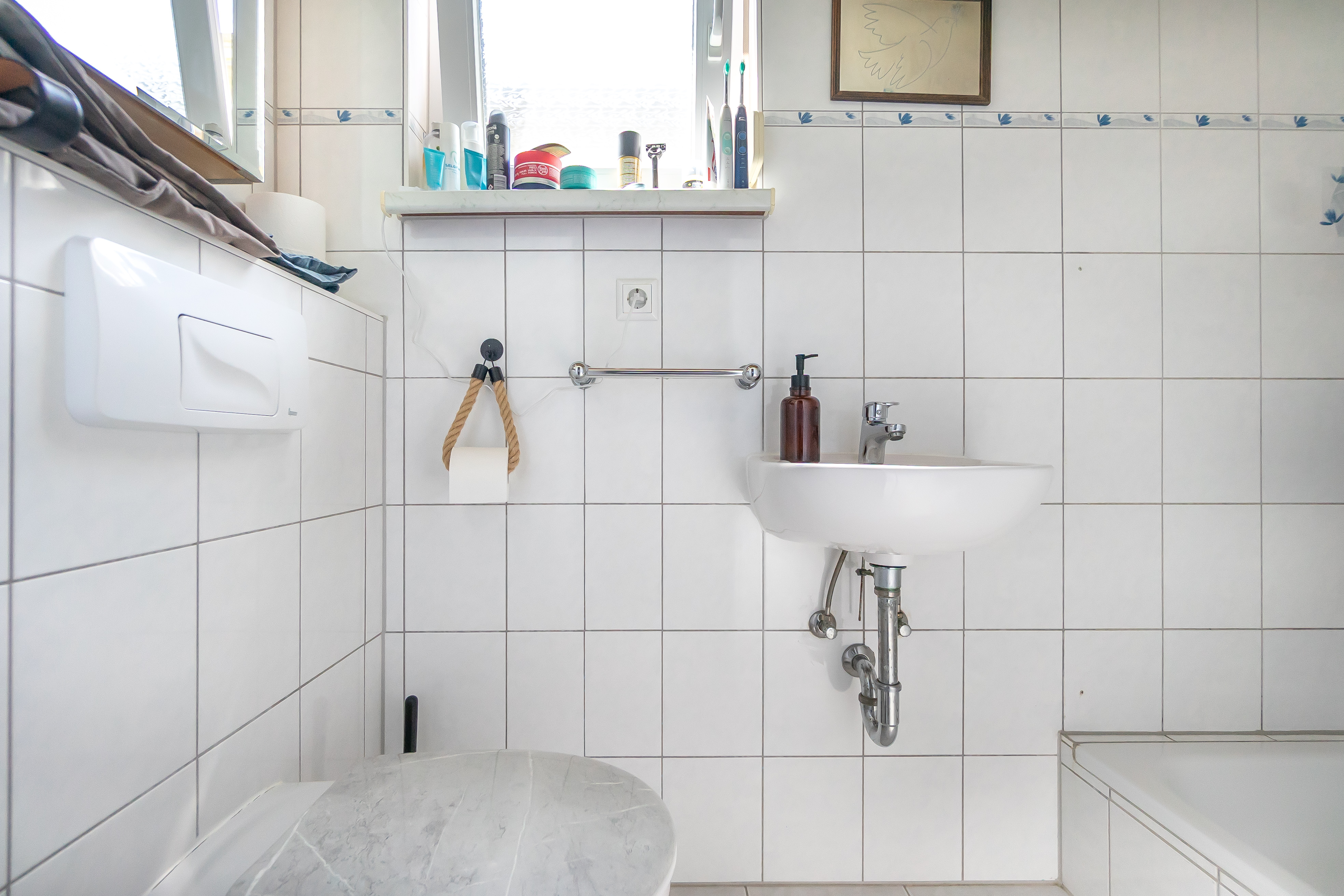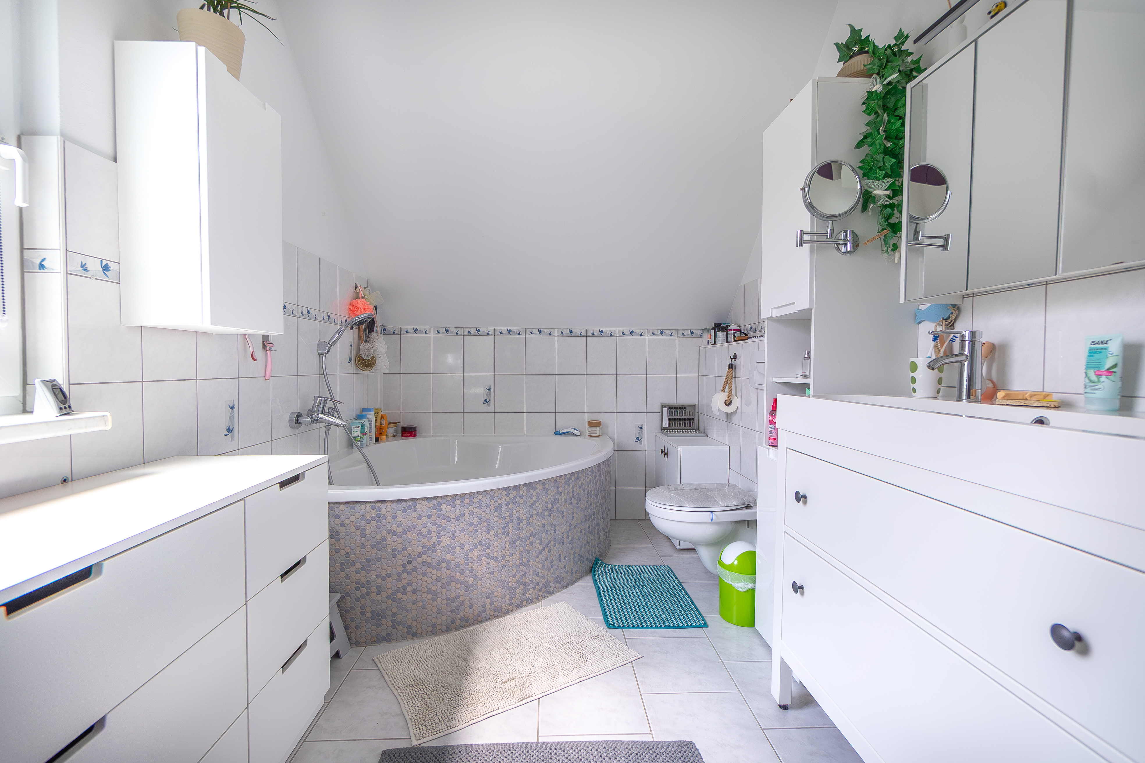 Über eine Kieferntreppe mit Handlauf führt der Weg ins Obergeschoss. Hier befinden sich ein Schlafzimmer, ein gut geschnittenes Kinderzimmer sowie ein weiteres Zimmer, das sich ideal als Homeoffice oder Gästezimmer eignet. Auch ein zweites, vollständig gefliestes Badezimmer mit Badewanne, Doppelwaschbecken und WC ist vorhanden. Vom Arbeitszimmer aus führt eine Treppe in die ausgebaute Dachspitze.