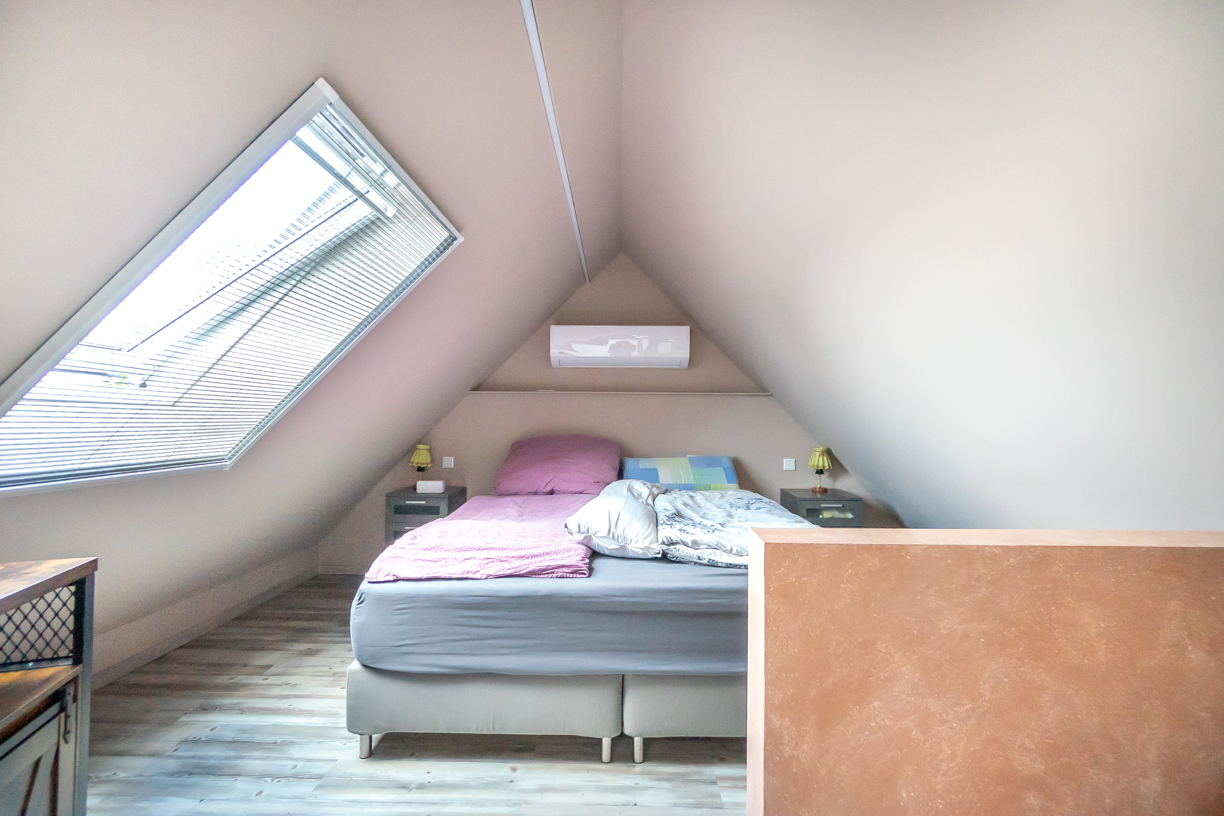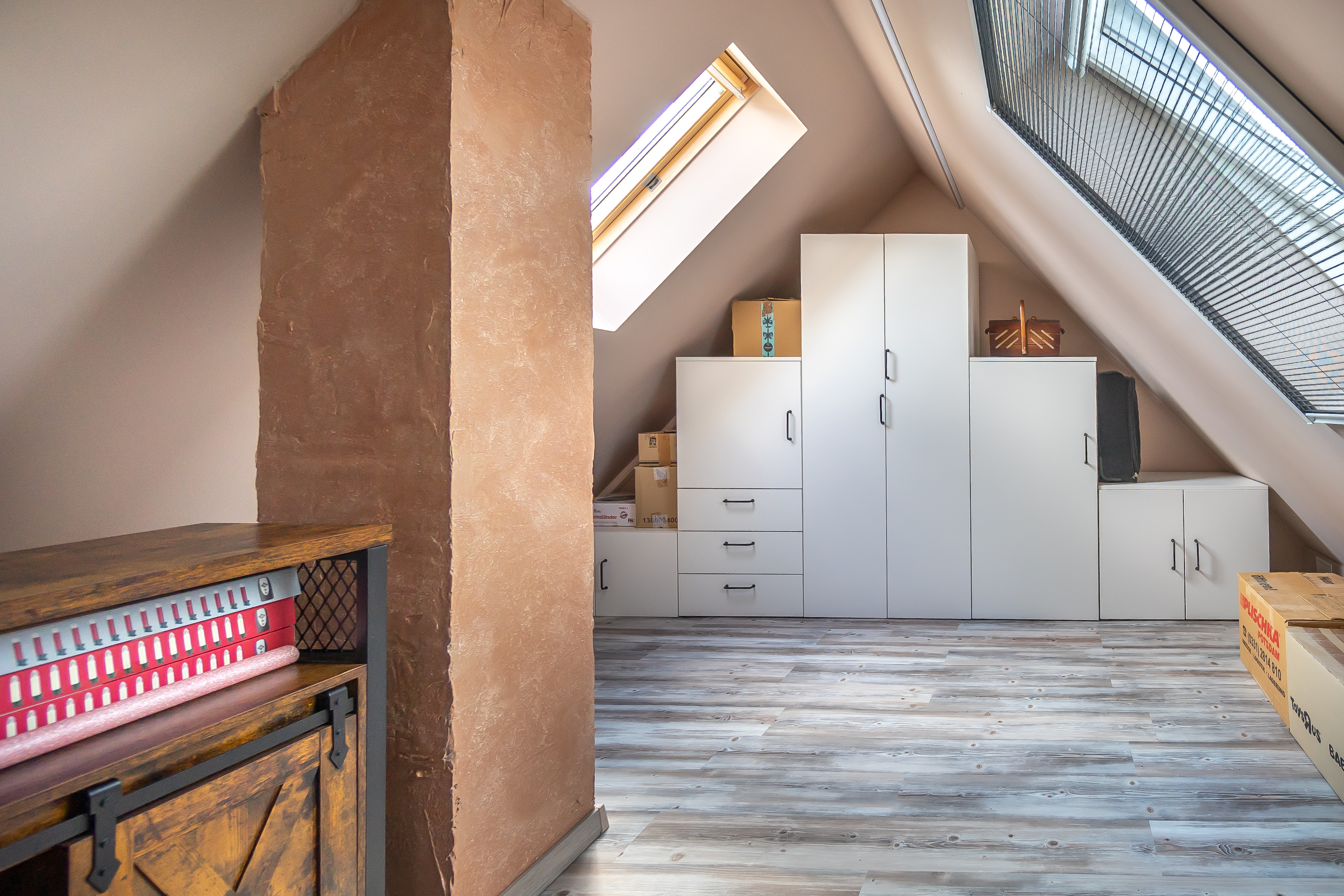 Der Spitzboden bietet einen zusätzlichen Raum, der sich flexibel als Spiel-, Schlaf- oder Rückzugsbereich nutzen lässt. Ein Klimagerät sorgt an warmen Tagen für angenehme Temperaturen, der Boden ist mit Vinyl-Klick-Belag ausgestattet.