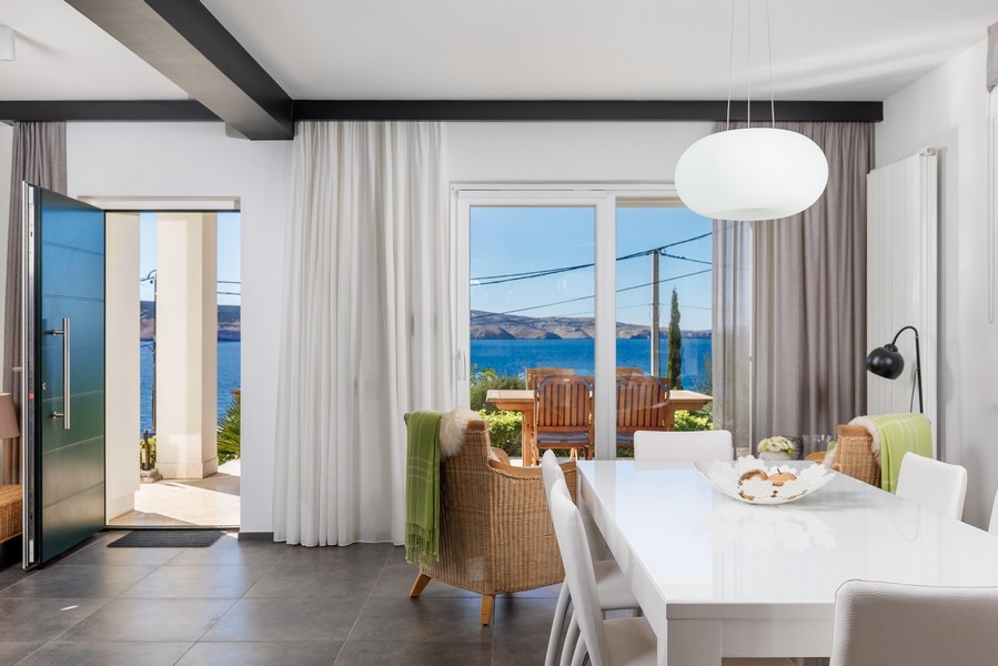 Auf der Rückseite des Hauses befinden sich ein Heizraum, eine Waschküche, ein Abstellraum sowie eine Garage mit direktem Zugang ins Haus. Von beiden Etagen bietet sich ein herrlicher Blick auf das nur rund 55 Meter entfernte Meer. Ein Weg führt direkt hinunter zur Küste.