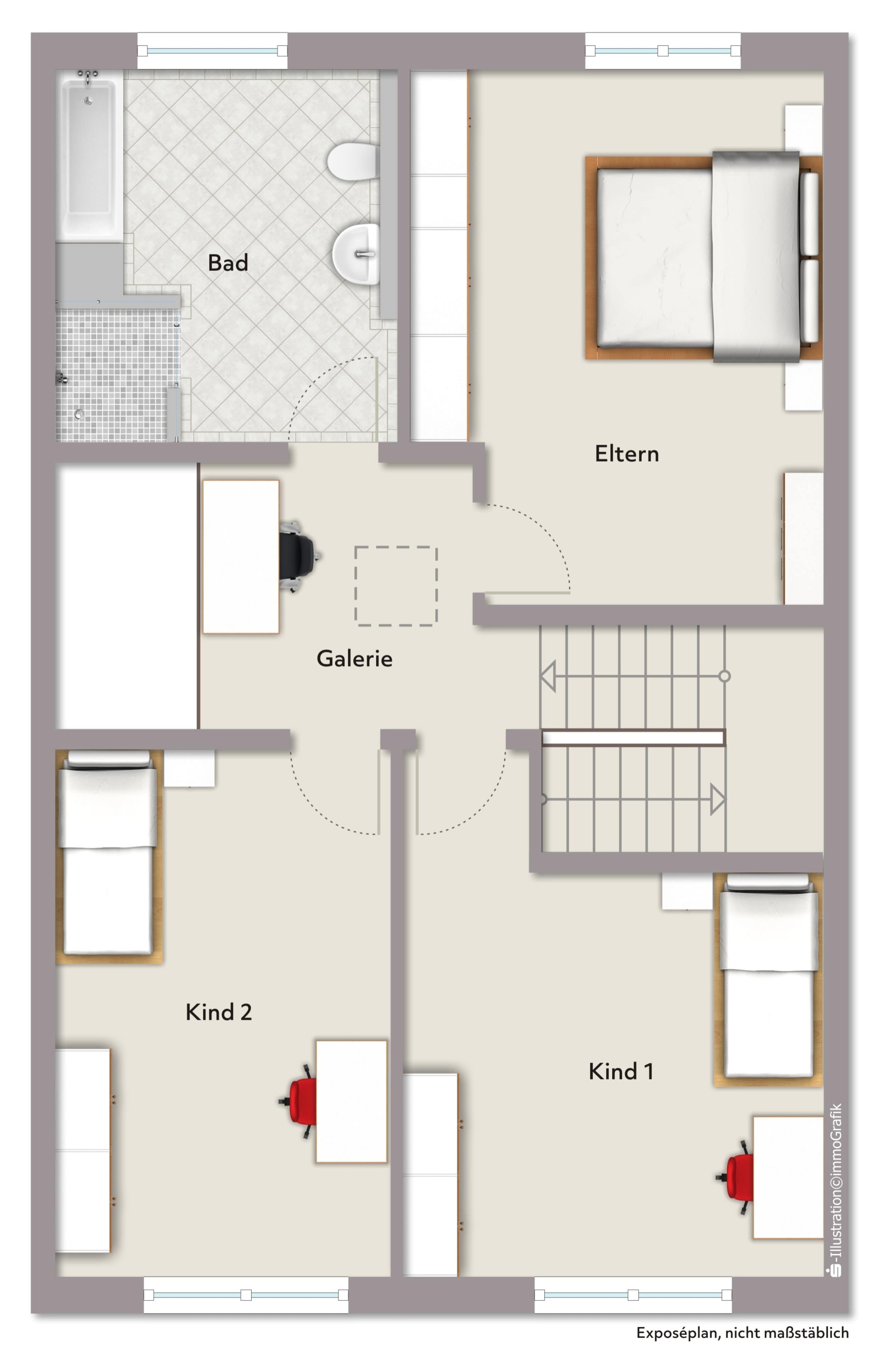 Im Obergeschoss erwarten Sie ruhige Rückzugsorte für die ganze Familie. Ob Schlafzimmer, Kinderzimmer oder Homeoffice – die Räume lassen sich flexibel gestalten und passen sich Ihren Lebensumständen an.