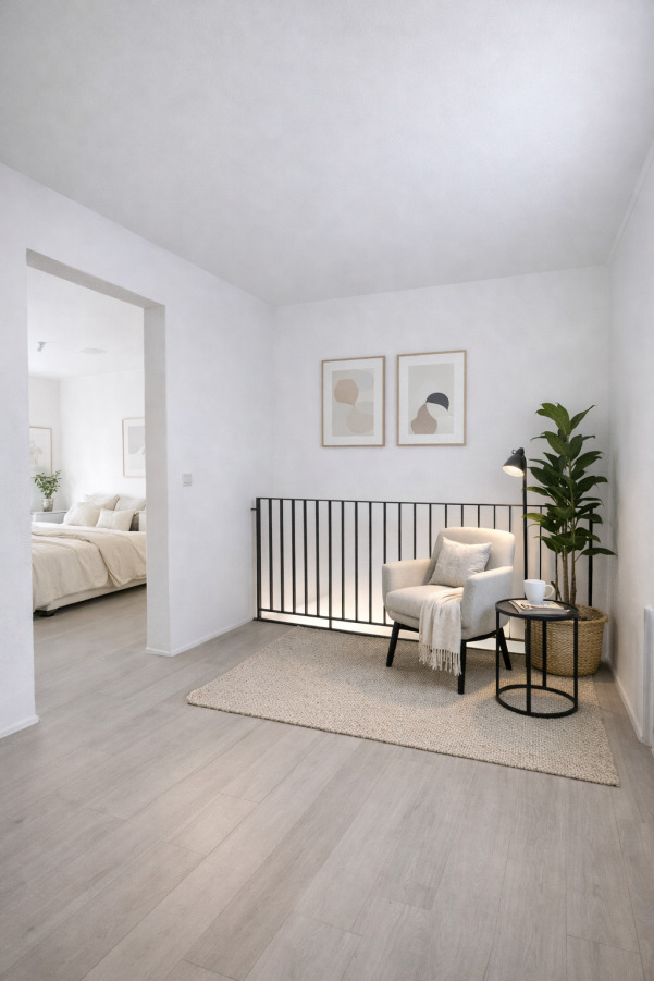 Ein besonderes Highlight ist die offene Galerie, die dem Haus eine moderne, luftige Note verleiht und spannende Blickbeziehungen schafft – ideal als Arbeitsplatz oder kreativer Rückzugsort.