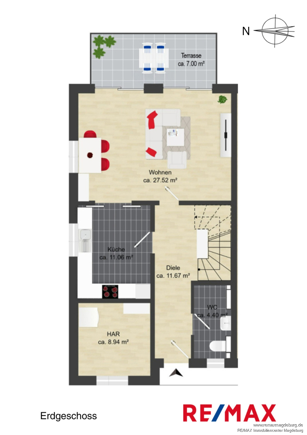 Erdgeschoss: - Diele, - HWR/HAR, - Gäste-Bad mit Dusche, - Wohnen und Essen mit Zugang zur Terrasse, - Kochen,