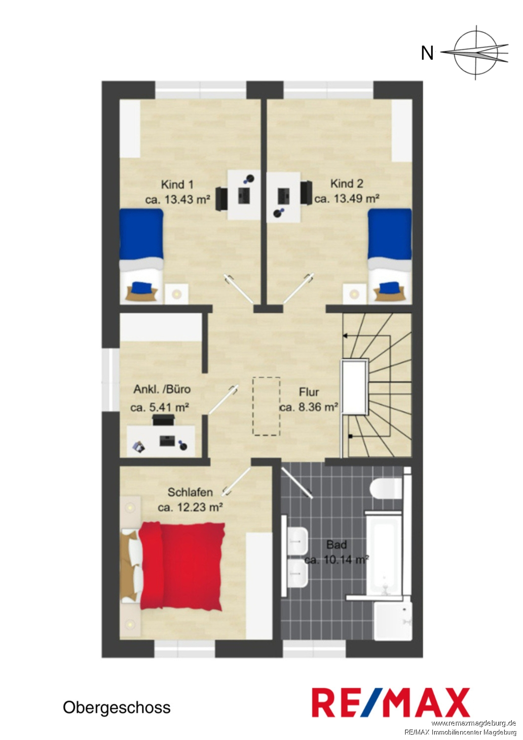 Obergeschoss: - Flur, - Schlafen, - Masterbad mit Dusche und Wanne, - Kind 1, - Kind 2, - Ankleide/Büro,