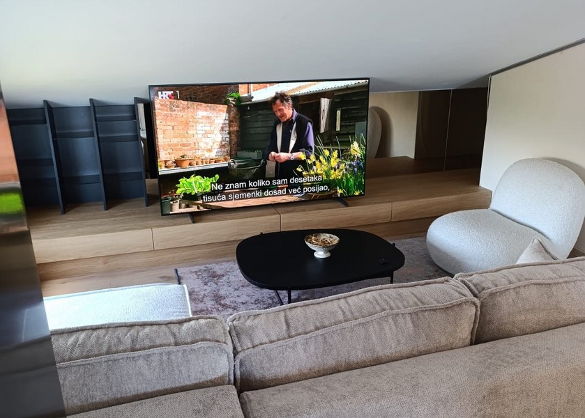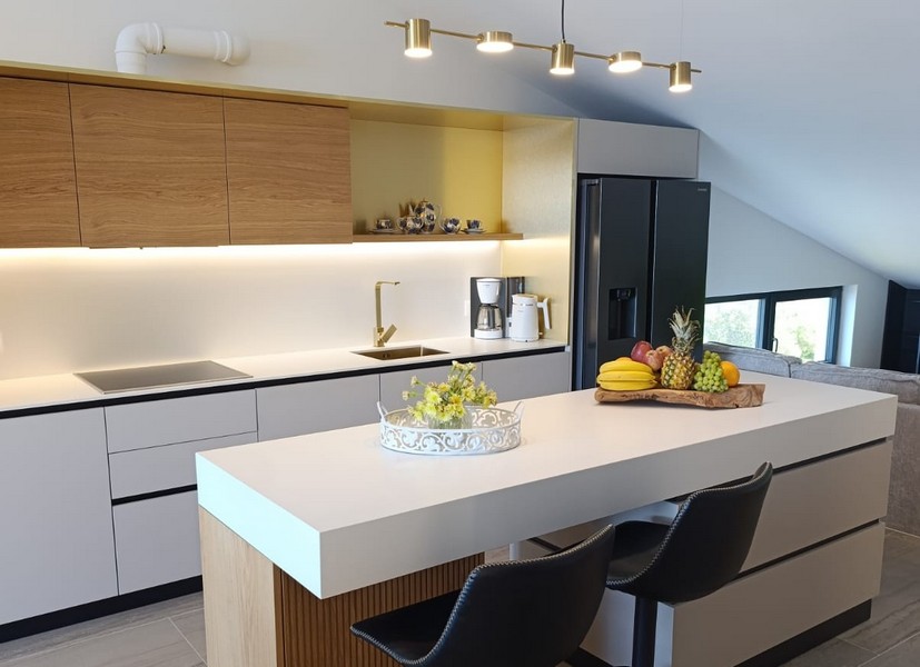 Die obere Etage besteht aus einem Wohnzimmer mit offener Küche und Essbereich sowie einer weiteren Terrasse.