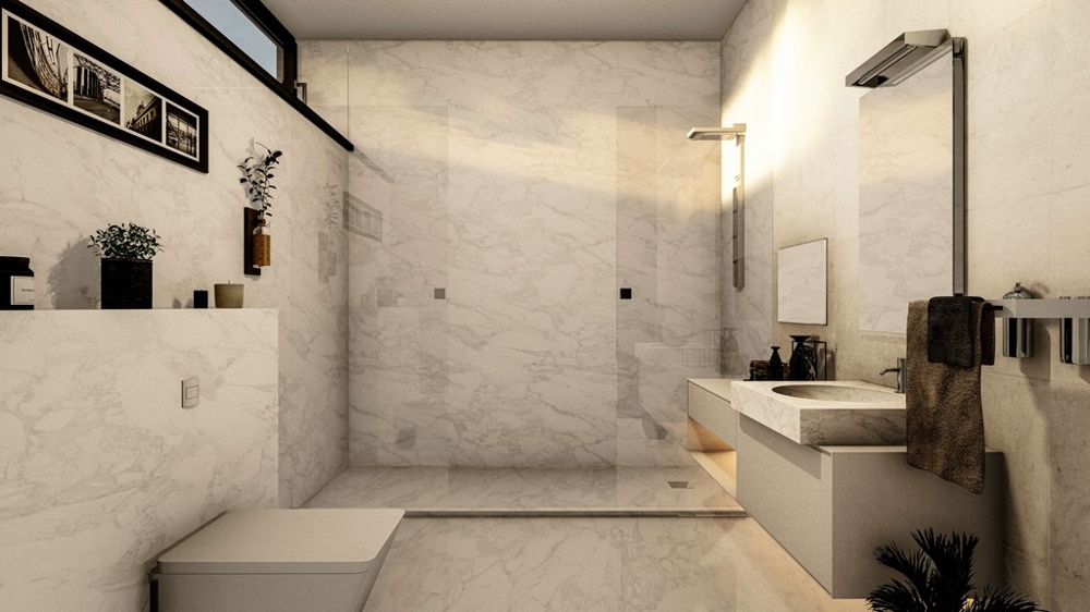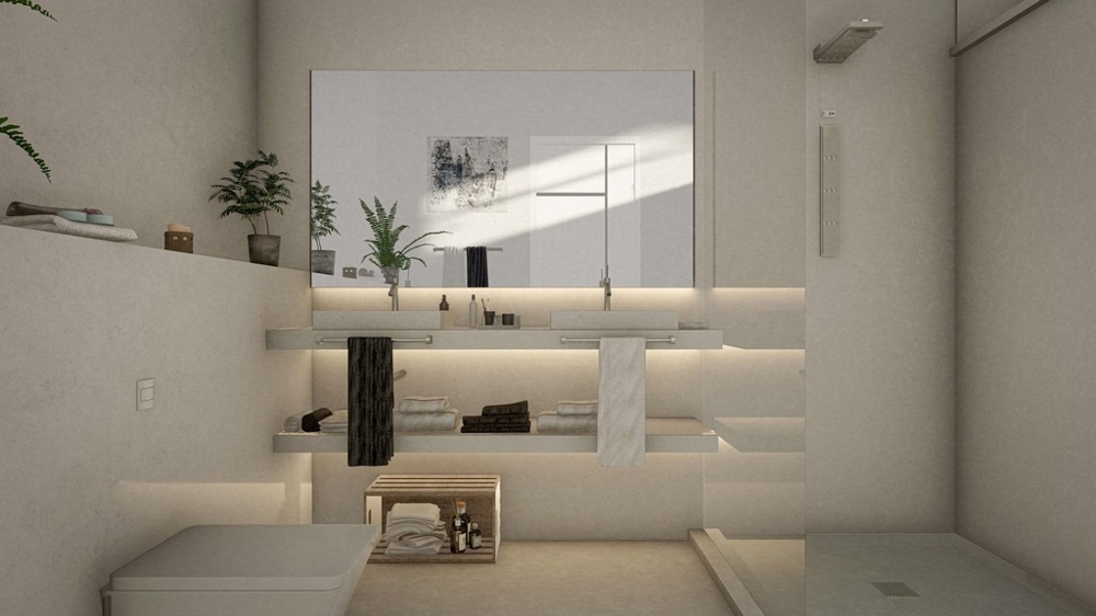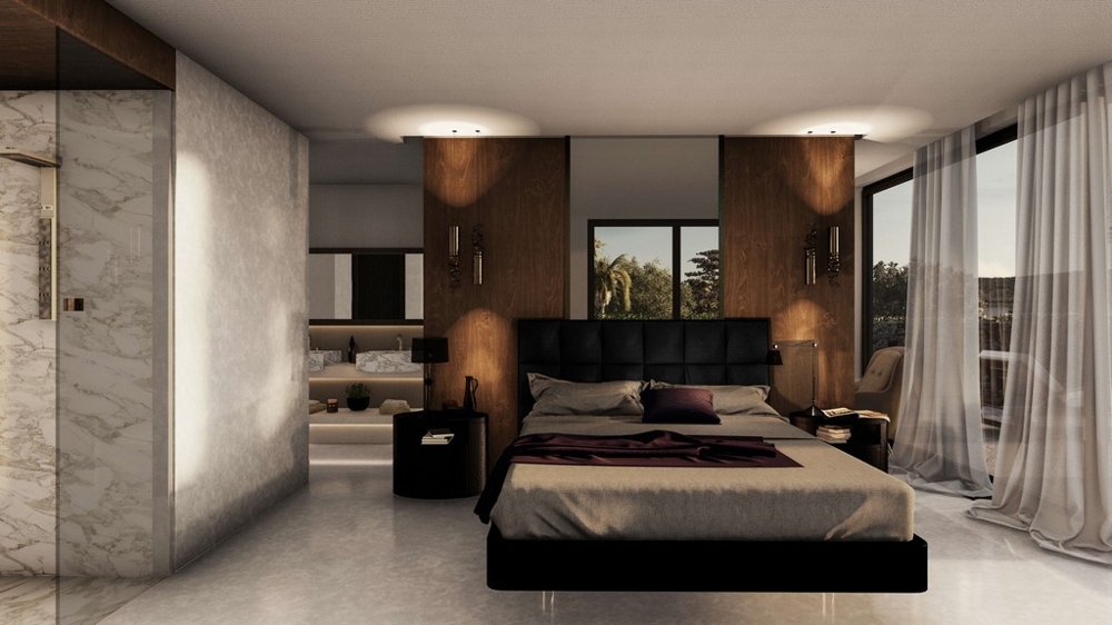 Die Wohnfläche verteilt sich auf drei Schlafzimmer mit je einem Badezimmer en-suite (das Master-Schlafzimmer verfügt zusätzlich über eine Garderobe), Wohnzimmer mit offener Küche und Essbereich, weiteres Badezimmer, große Terrasse. Zudem die private Dachterrasse.