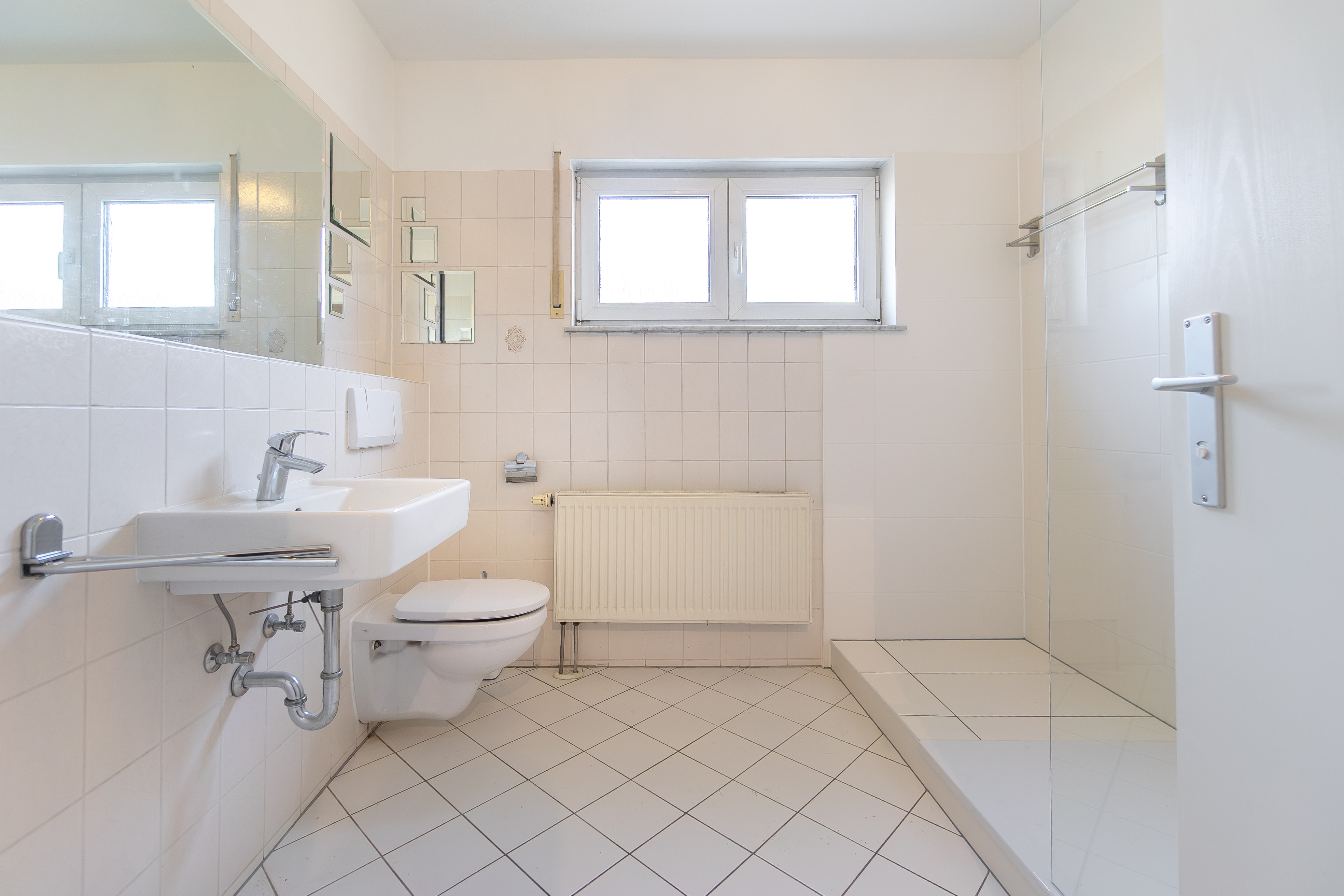 Das Obergeschoss verfügt über einen Mittelflur mit textilem Bodenbelag. Neben einem geräumigen Schlafzimmer stehen ein Arbeitszimmer und ein Kinderzimmer zur Verfügung, die ebenfalls mit Laminat ausgestattet sind. Das Tageslichtbad ist gefliest und bietet eine Dusche, ein Waschbecken sowie ein WC.