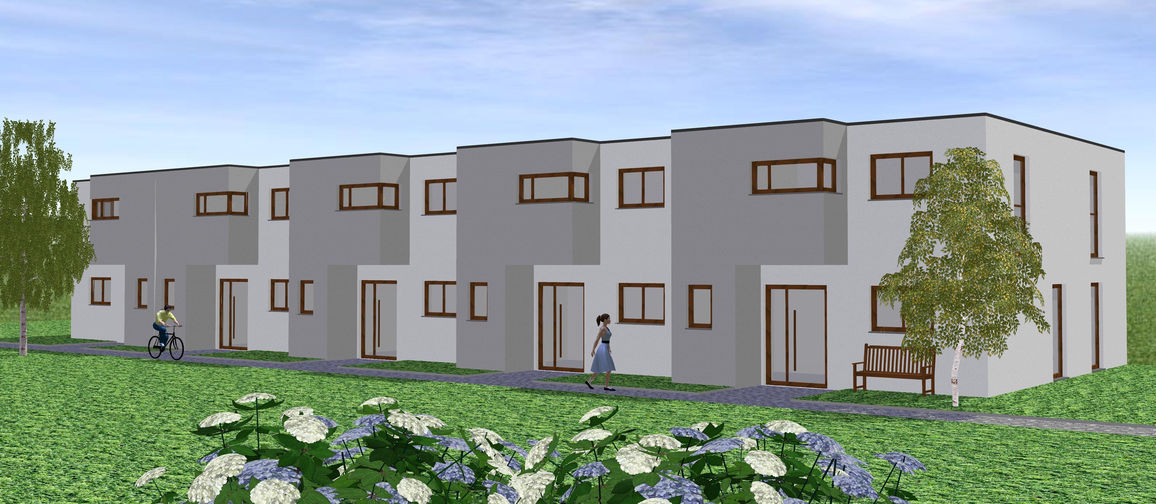 Reihenhäuser, 2 gesch. Bauweise, begrüntes Flachdach, weiße Putzfassade. An der Vorderseite des Hauses werden Teilflächen mit grauer Putzfassade versehen.