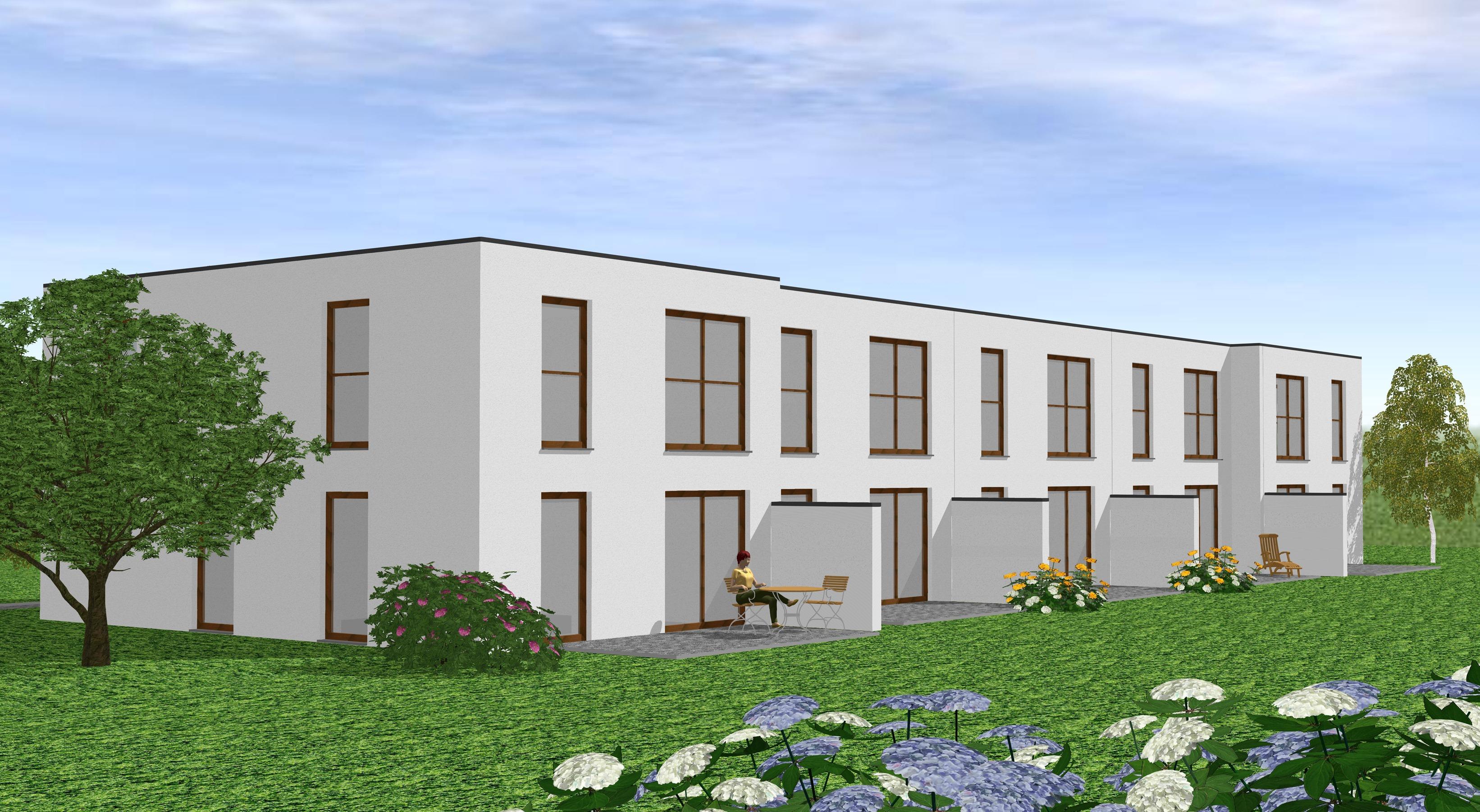 Reihenhäuser, 2 gesch. Bauweise, begrüntes Flachdach, weiße Putzfassade. An der Vorderseite des Hauses werden Teilflächen mit grauer Putzfassade versehen.