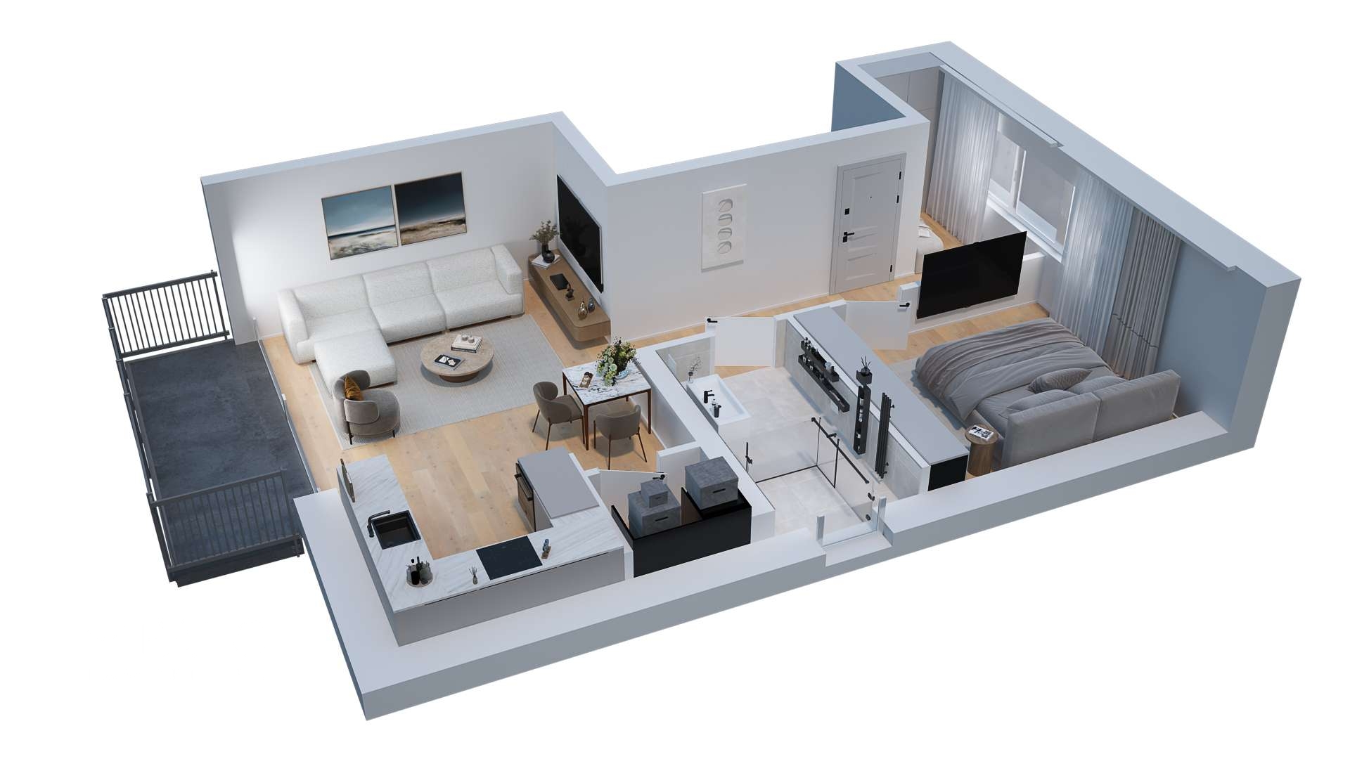Die Wohnung verfügt über eine gut durchdachte Zwei-Zimmer-Aufteilung mit einem hellen Wohn- und Essbereich sowie einem separaten Schlafzimmer. Ein modernes Badezimmer ergänzt das Raumangebot. Die Wohnfläche beträgt 61,51 m² und wird durch einen Balkon mit 6,24 m² ergänzt, der zusätzlichen Freiraum im Obergeschoss bietet.