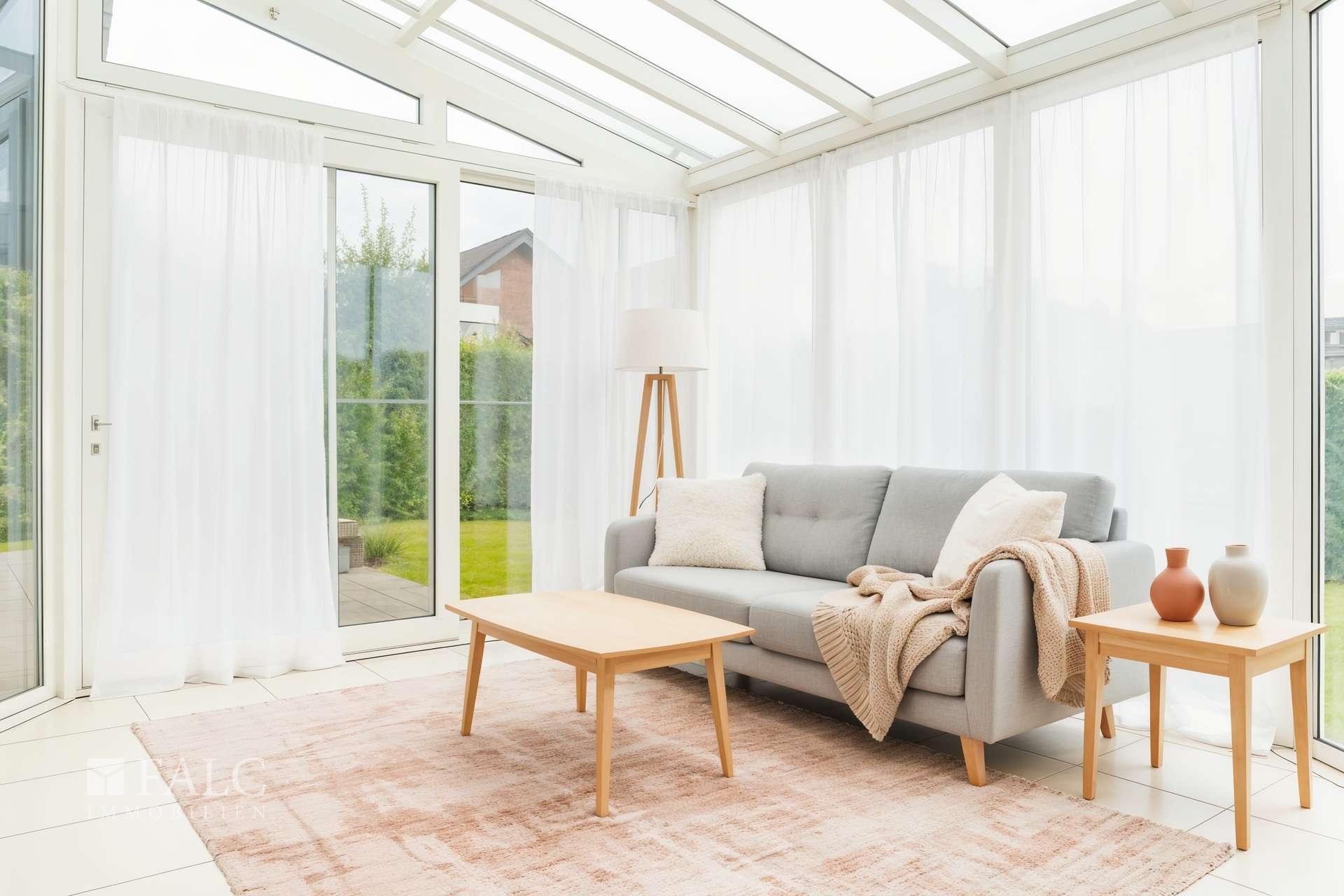 Von der Küche aus führt der Weg weiter in das weitläufige Wohnzimmer mit großen Fensterfronten, die für viel Tageslicht sorgen. Der angeschlossene Wintergarten bietet einen herrlichen Blick in den gepflegten Garten. Ein separates Kaminzimmer lädt zum Entspannen in gemütlicher Atmosphäre ein. Ein Gäste-WC befindet sich ebenfalls im Erdgeschoss, direkt im Eingangsbereich. Über die Küche erreichen Sie eine kleine Seitenterrasse, während Sie vom Wohnzimmer oder Wintergarten auf die überdachte Hauptterrasse mit Außenkamin gelangen – perfekt für gesellige Abende und entspannte Stunden im Freien.