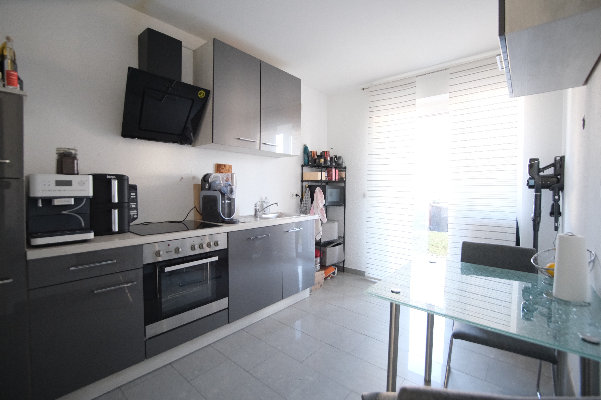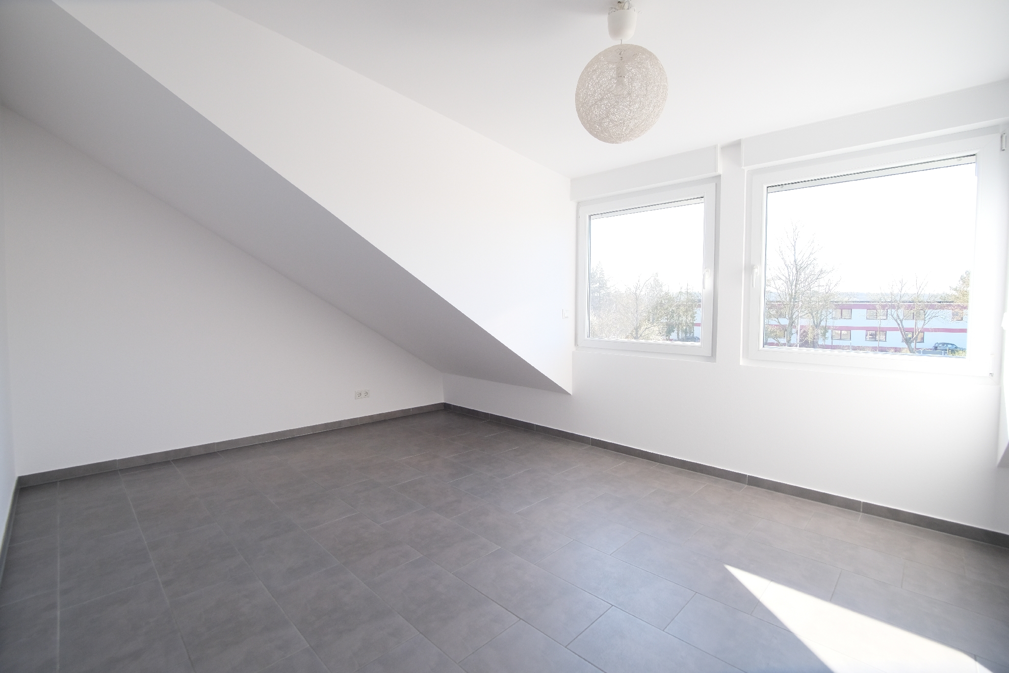 Wohnung 2: Diese 4-Zimmer-Wohnung erstreckt sich über zwei Etagen (Obergeschoss und Dachgeschoss). Der Eingangsbereich im Obergeschoss ist sehr großzügig gestaltet und bietet viel Platz für eine Garderobe oder eine Kommode. Das gemütliche Wohn- und Esszimmer hat einen Blick in den sonnigen Garten. Aus der Küche kann zudem der Balkon betreten werden. Ein Büro oder Kinderzimmer, sowie das moderne Dusch-Bad mit Waschbecken, WC und einem Waschmaschinen-Anschluss vervollständigen diese Etage. Über eine Treppe innerhalb der Wohnung gelangen Sie in das Dachgeschoss. Hier befinden sich das Elternschlafzimmer sowie ein weiteres Kinderzimmer. Zusätzlich verfügt das Dachgeschoss über ein weiteres Wannen-Bad, das für zusätzlichen Komfort sorgt. In einem Heizungsraum unter der Schräge befindet sich die Brennwerttherme mit dem Wasserspeicher. Zu dieser Wohnung gehört die Garage mit dem Zugang zum eigenen Garten.