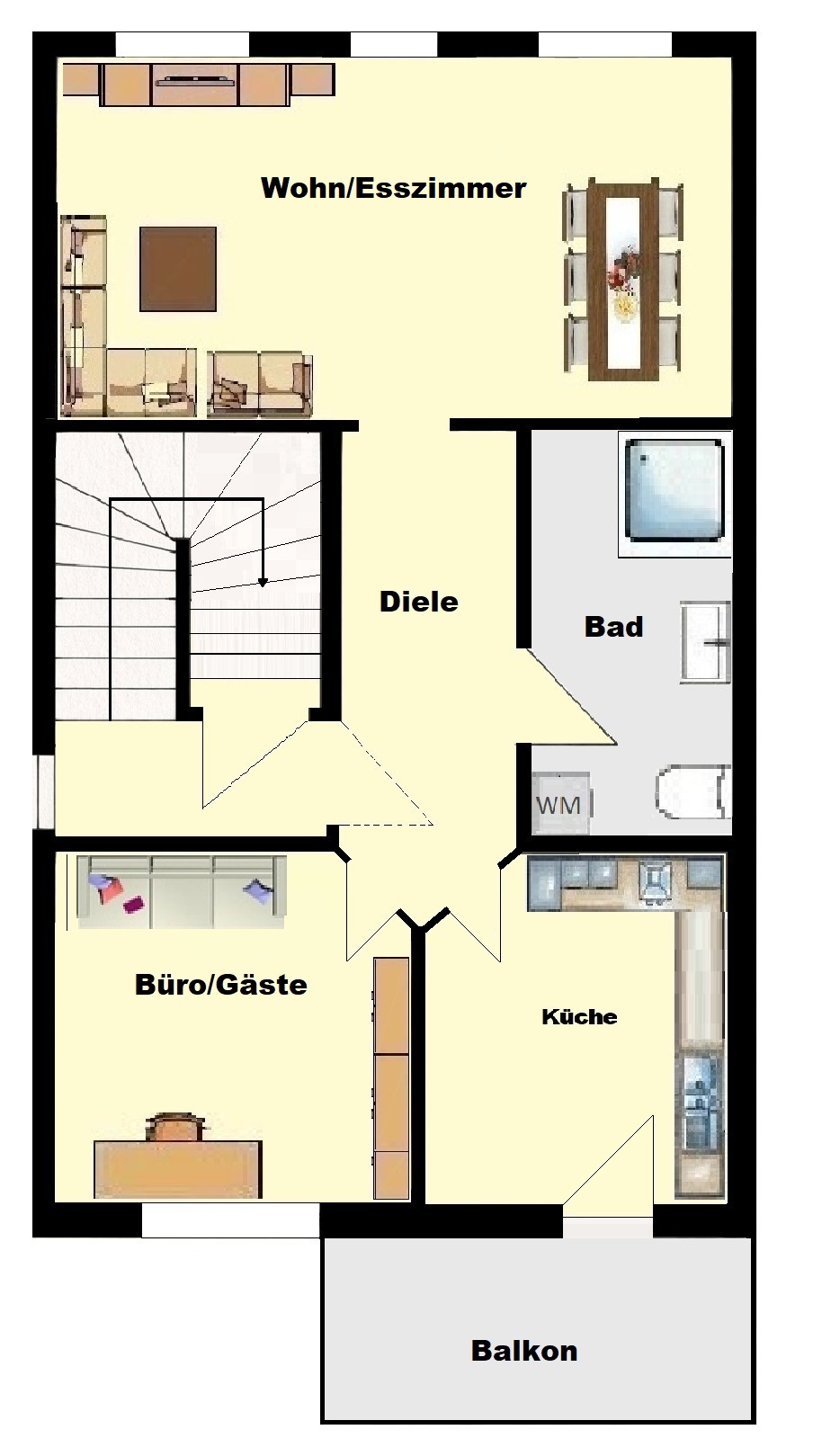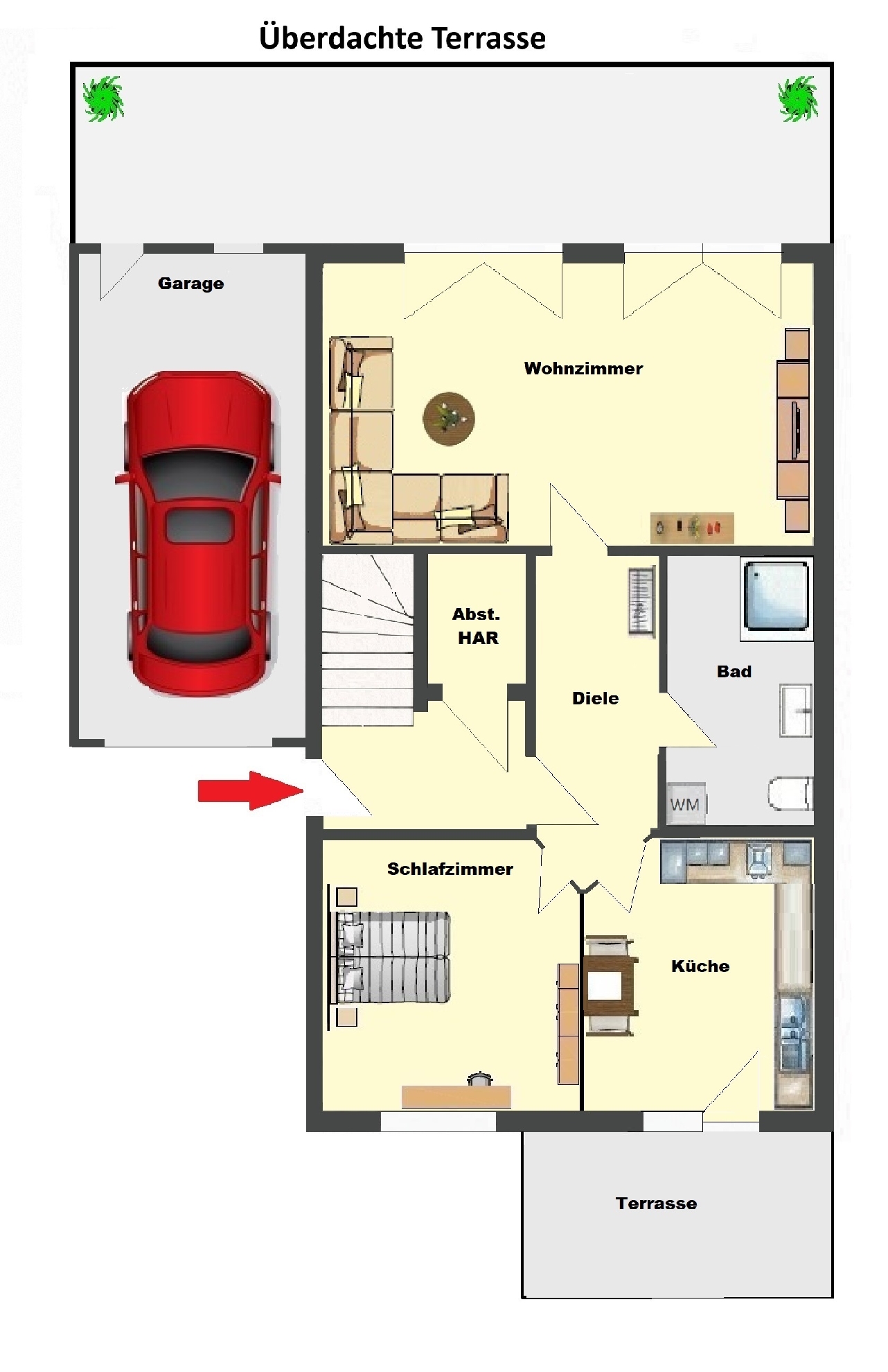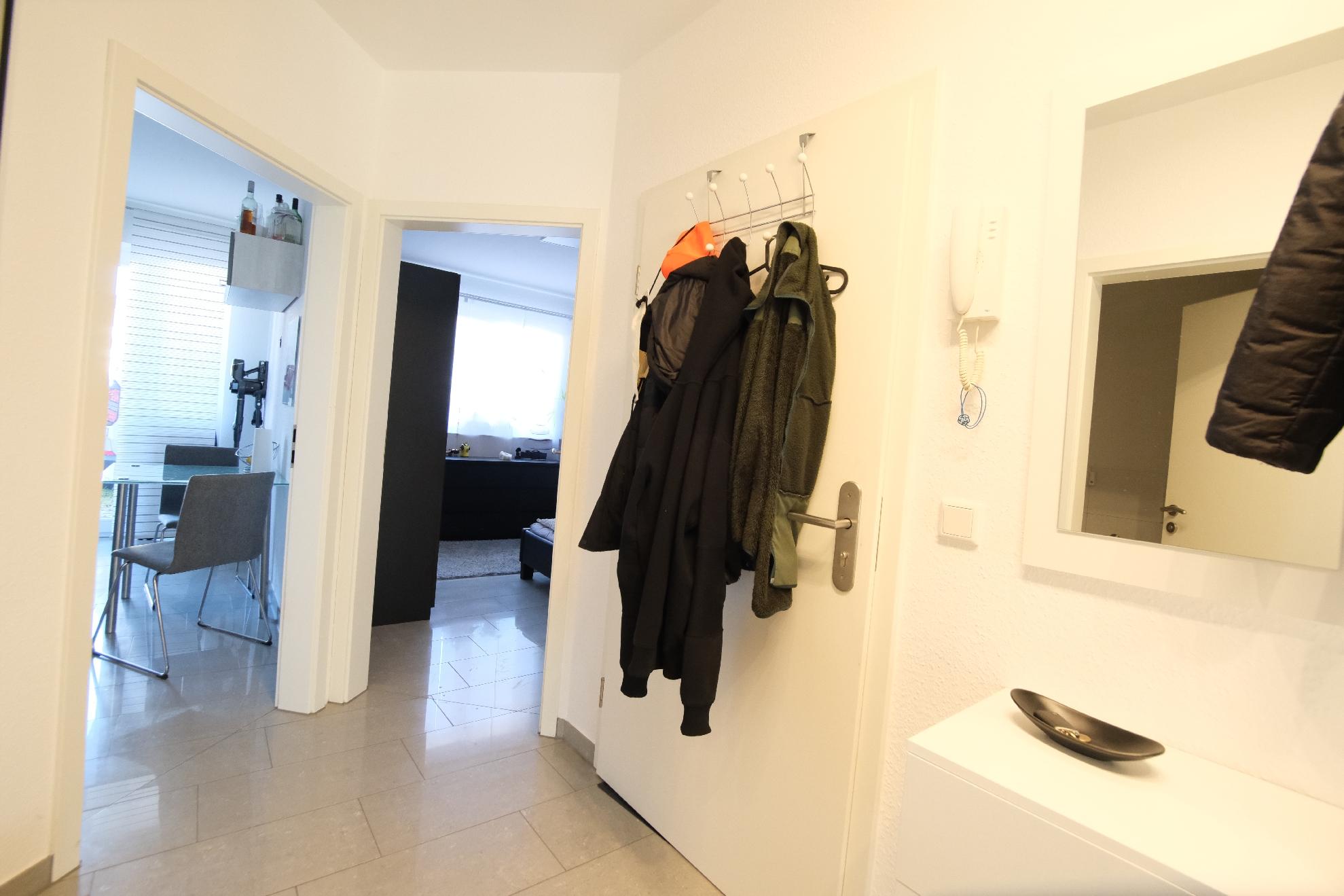 Durch die Haustür gelangen Sie in den Hausflur, von dem aus Sie Zugang zur Wohnung 1 im Erdgeschoss sowie zur Maisonette-Wohnung 2 im Obergeschoss haben. Unter der Treppe im EG befindet sich der Hausanschlussraum.