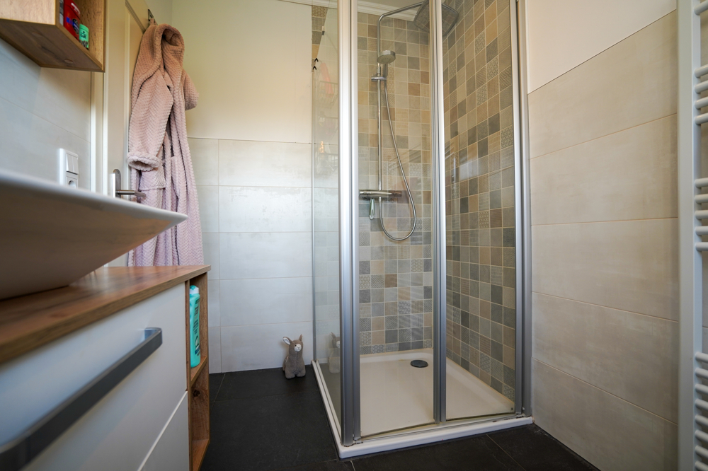 Das Erdgeschoss überzeugt durch eine durchdachte Raumaufteilung: Hier befinden sich eine großzügige Küche, ein einladendes Wohnzimmer, zwei Flurbereiche, ein Hauswirtschaftsraum sowie ein modernes Badezimmer mit Dusche, WC und Waschbecken. Zusätzlich steht ein separates Gäste-WC zur Verfügung.