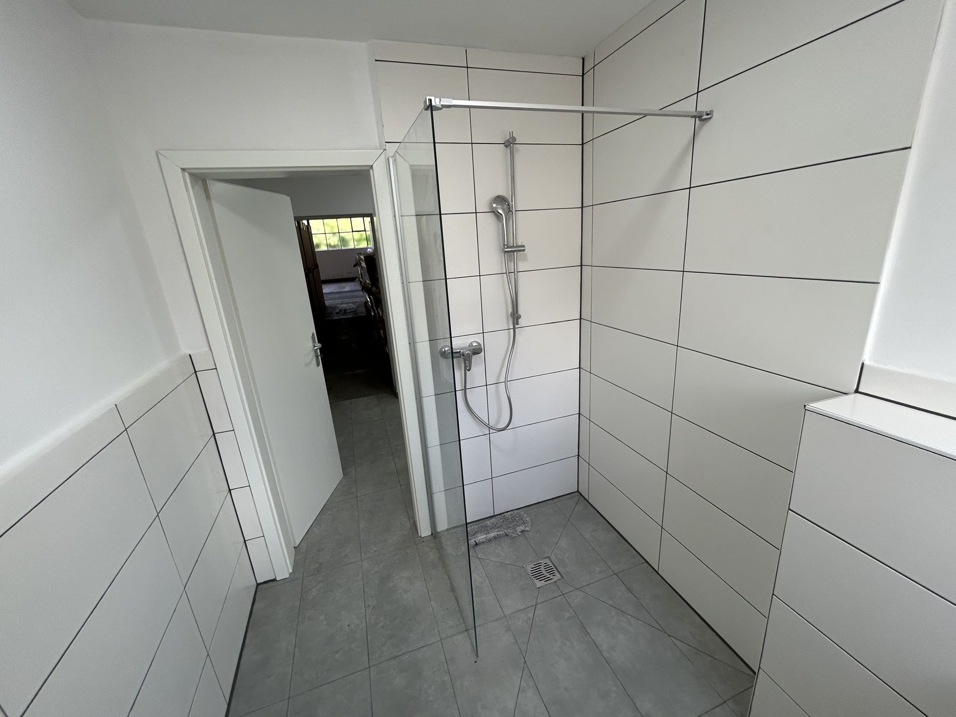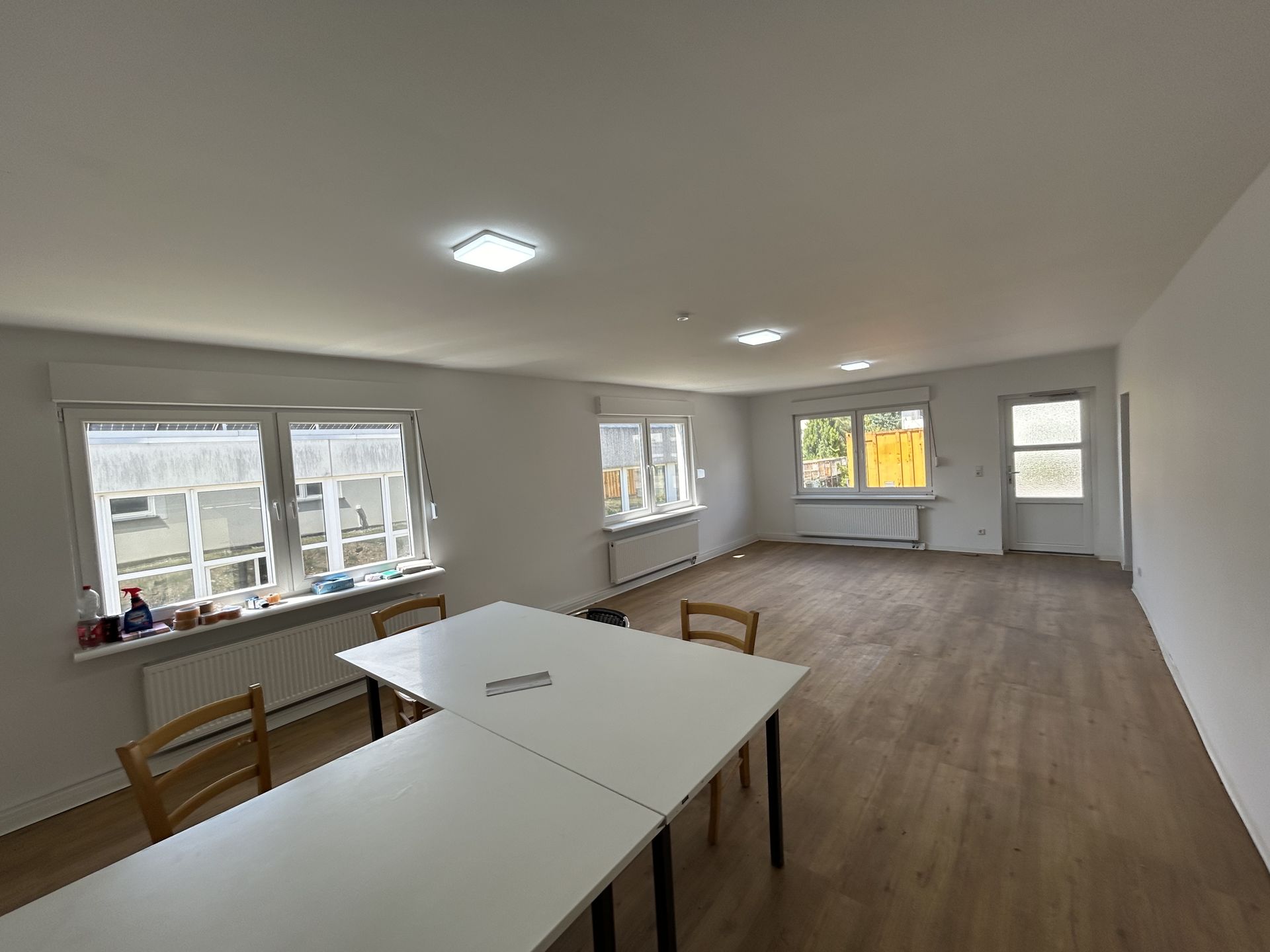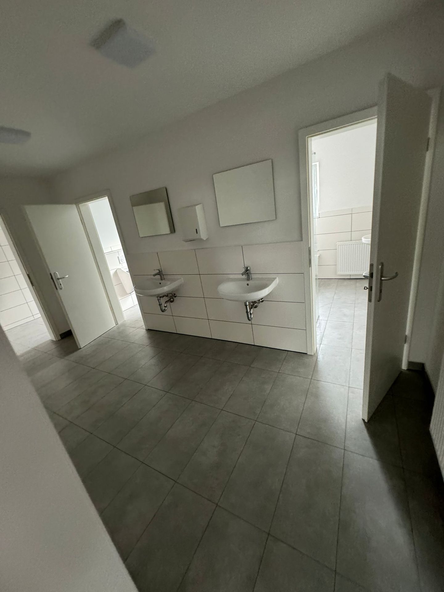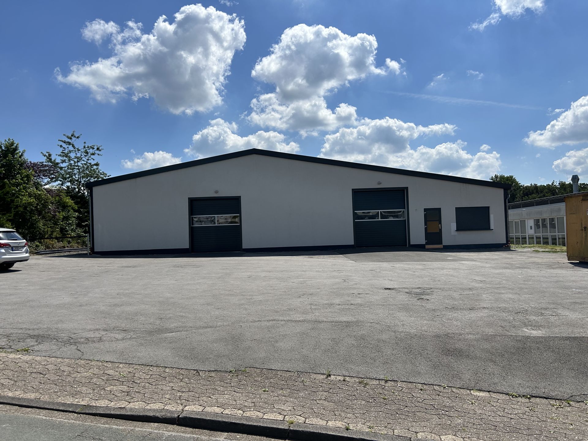 Die Doppelhalle nebst 2 Büros, Sanitärräumen mit Glasduschen, Lager-, Heizungs- und Hausanschlussraum wurde 2022 umfassend modernisiert (neues Sandwichdach mit Lichtkuppeln; neue geflieste Bäder mit Glasduschen, neue Fenster in den Büros + Nebenräumen, neue Rolltore, neue Brennwertgasheizung (>90 kW), ...) und mit einer LKW-tauglichen Hallenumfahrt versehen, über die man das Rolltor zur hinteren Halle (ca. 1.100 m², ca. 4,50 - 6 m Innenhöhe) erreichen kann.