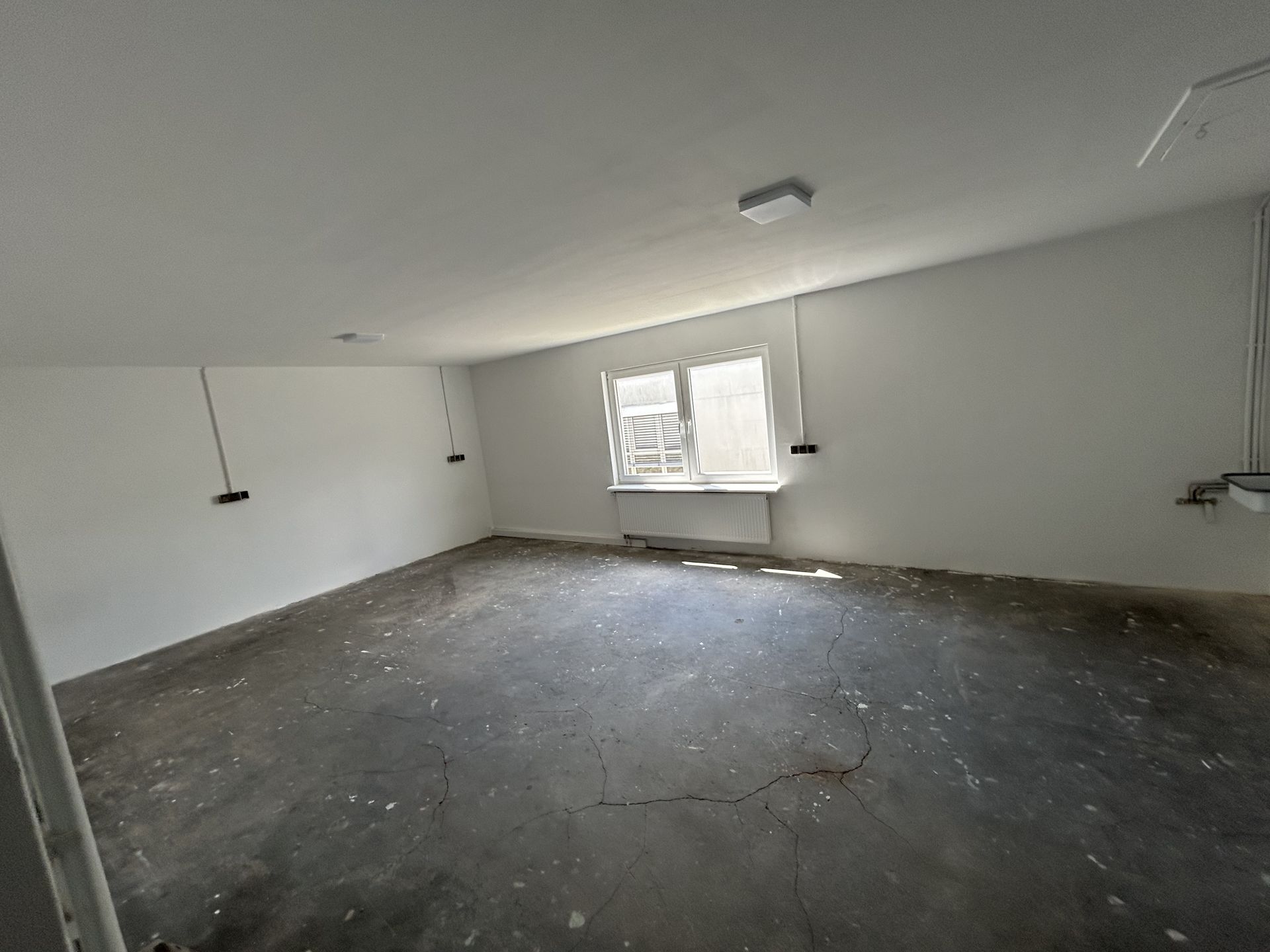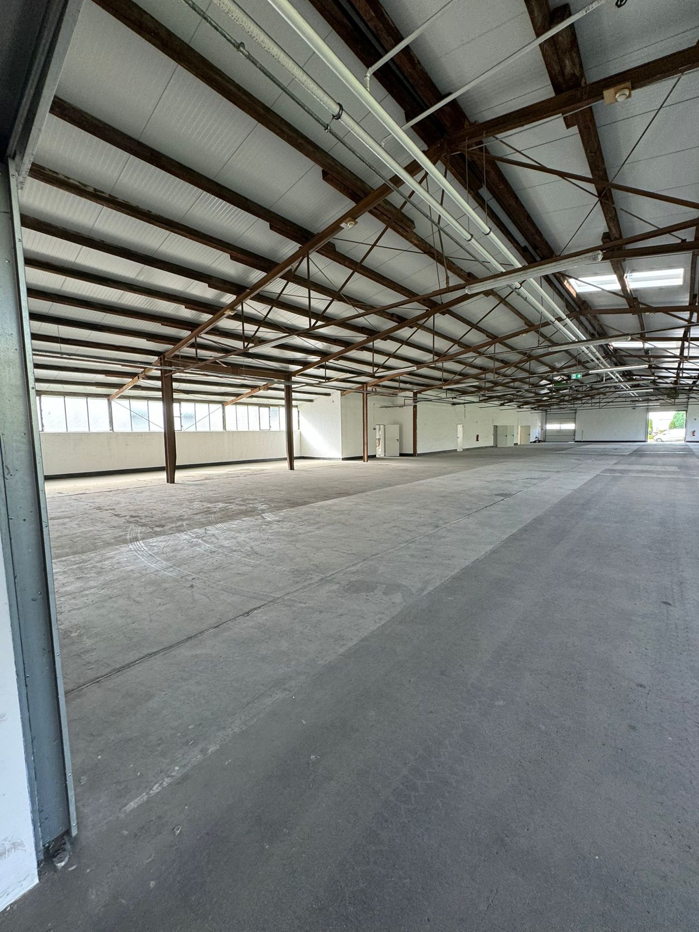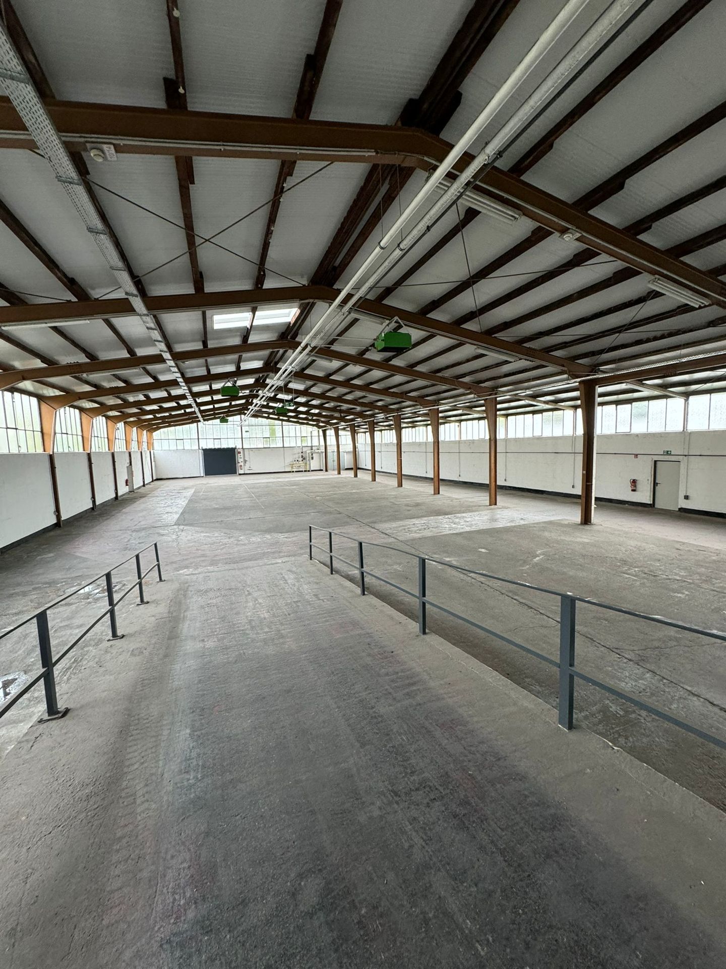 Die vordere Halle (ca. 1.150 m², 2 Rolltore (3,00 x 3,20 m), ca. 2,80 bis 5,20 m Innenhöhe) ist mit der hinteren Halle über ein Brandschutzrolltor und eine LKW-taugliche Rampe (Höhenversatz > 1,5 m) verbunden. Sie beherbergt an der Südseite die Funktions-, Personal- und Büroräume, die auch über einen separaten Eingang erreichbar sind.