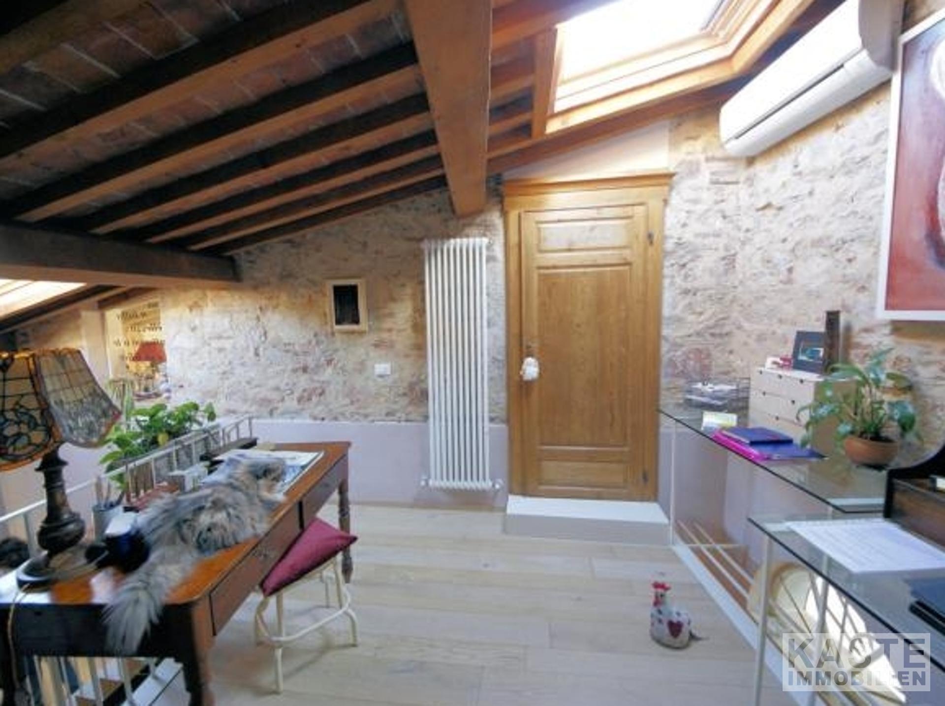 Terrakotta-Böden im Wohnbereich und Holzboden im Obergeschoss.