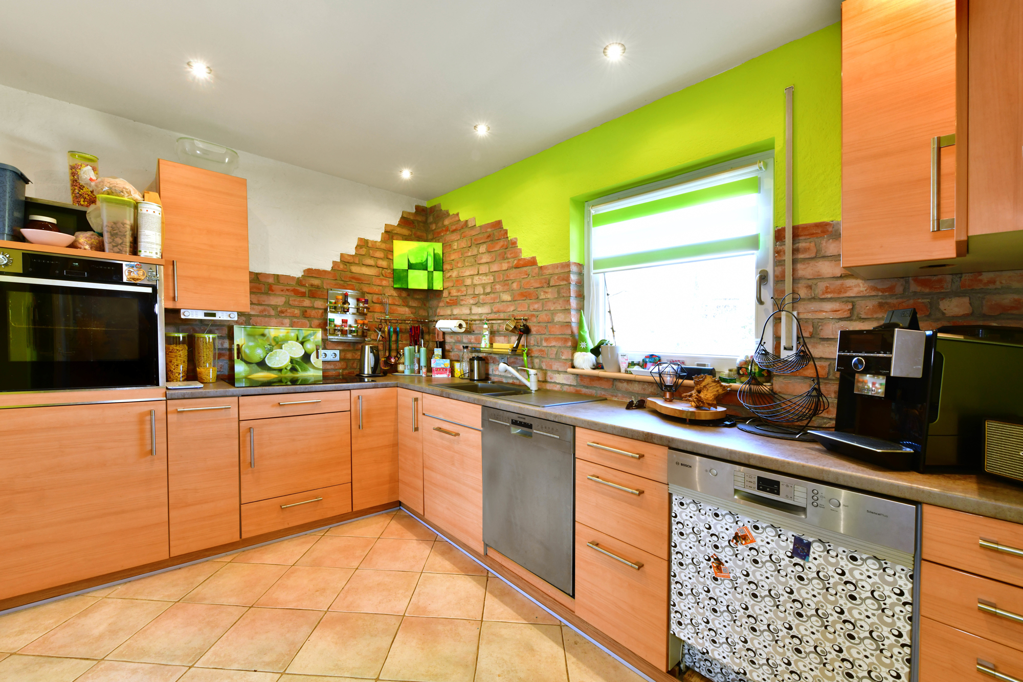 Die moderne Einbauküche ist harmonisch in den Essbereich integriert, der durch den Wintergartenstil eine besonders warme und einladende Atmosphäre schafft.