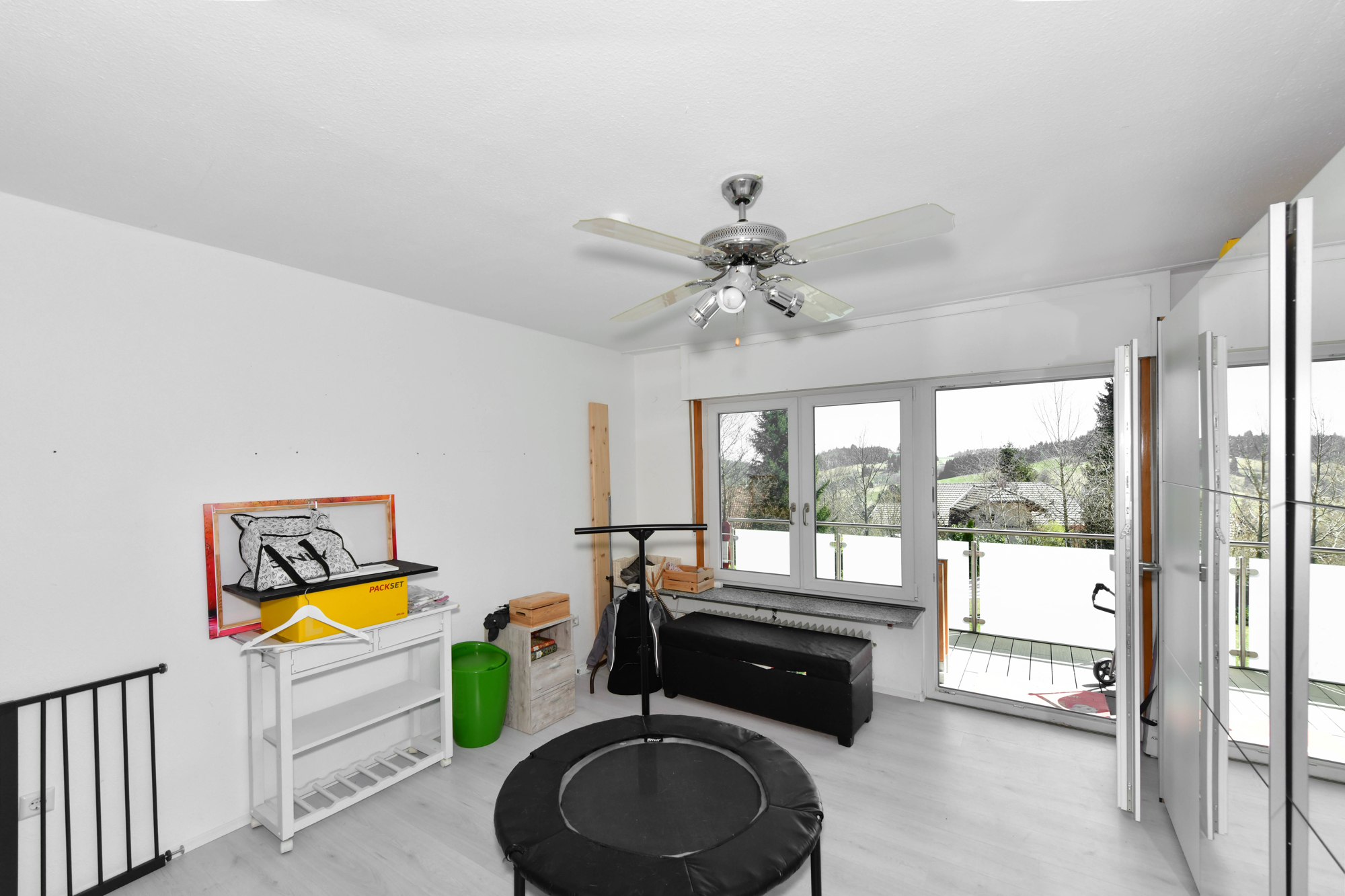 Das Schlafzimmer mit Ankleidezimmer verfügt über direkten Zugang zum Balkon mit Blick ins Grüne und auf den Skilift in Herrischried.