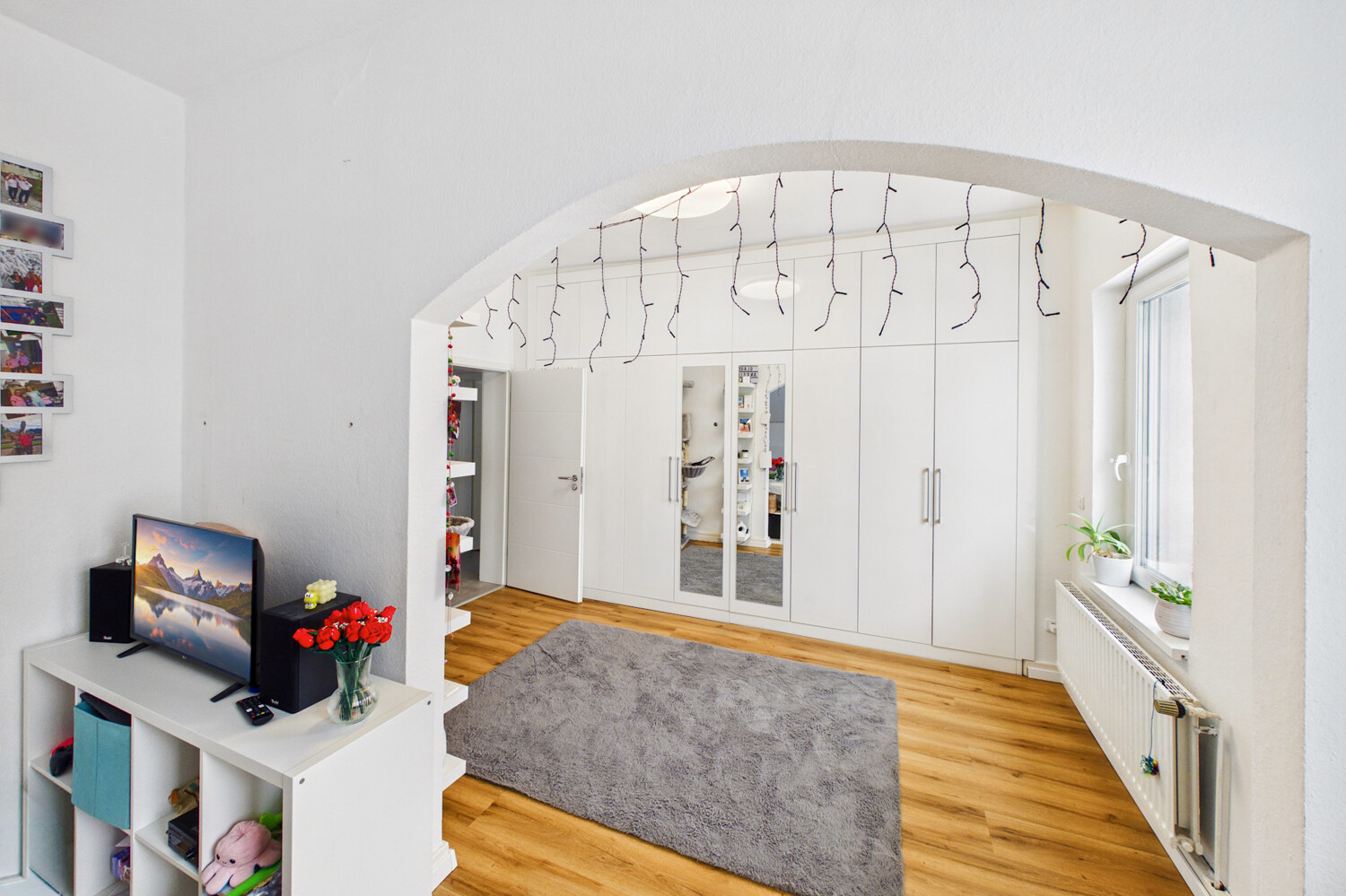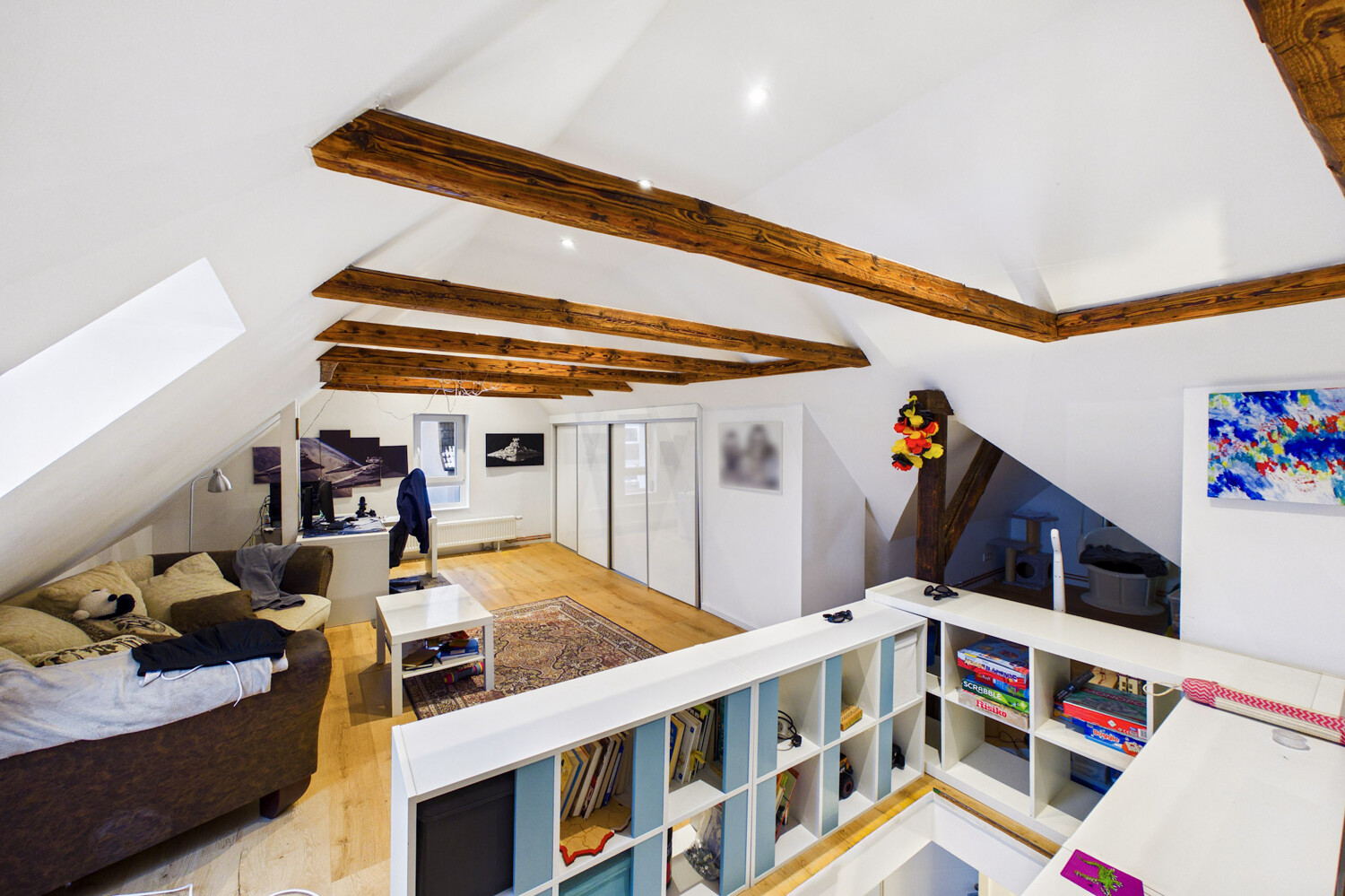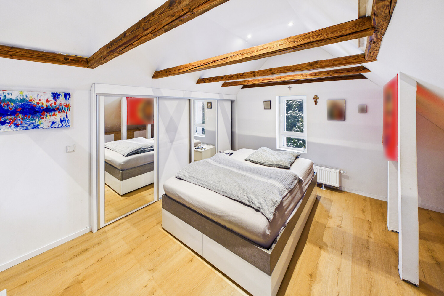 Im Zuge des Dachgeschossausbaus wurden die ursprünglichen Holzbalken freigelegt, die dem Raum ein besonderes, wohnliches Ambiente verleihen und den historischen Charakter des Hauses auf moderne Weise sichtbar machen. Diese Kombination aus historischer Substanz und zeitgemäßer Wohnästhetik verleiht der Immobilie ihren unverwechselbaren Charme.