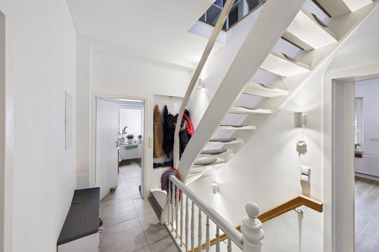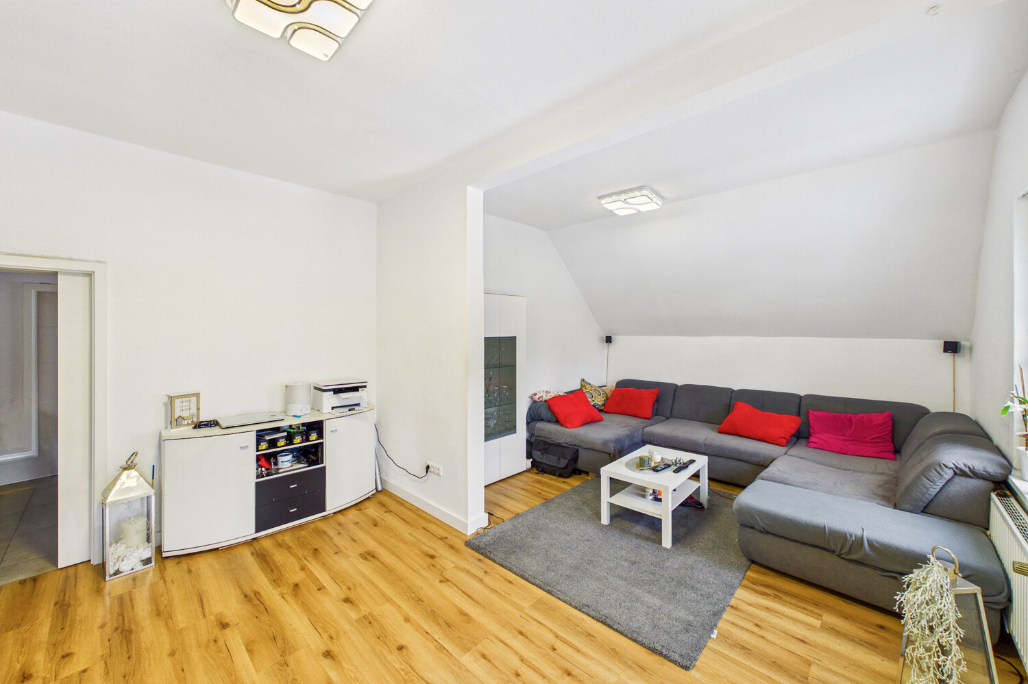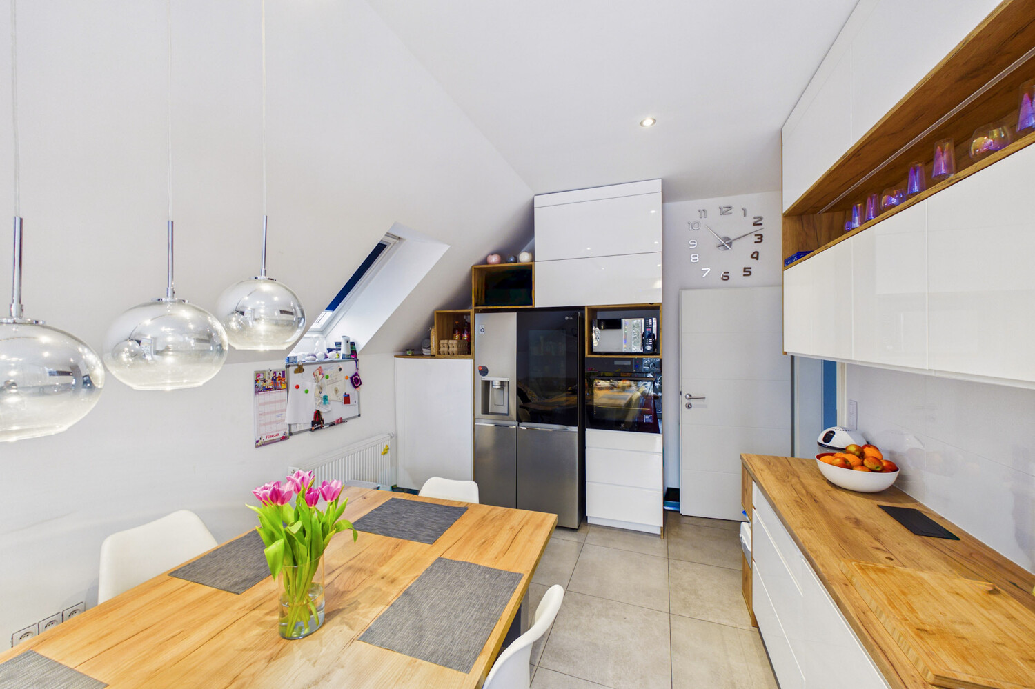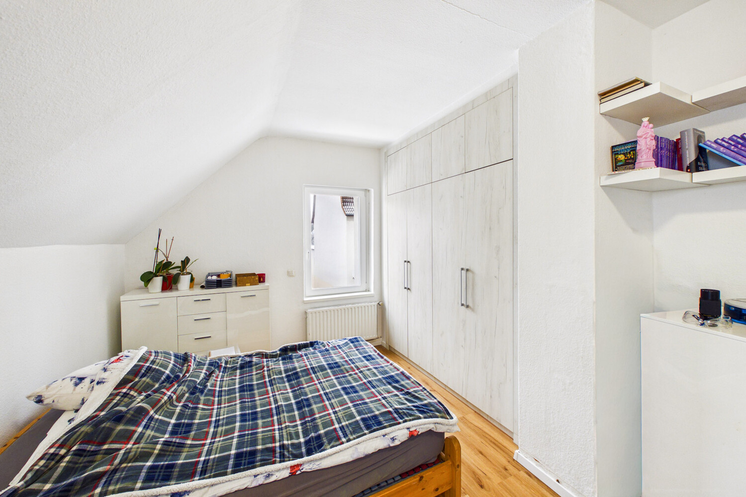 Im Zuge des Dachgeschossausbaus wurden die ursprünglichen Holzbalken freigelegt, die dem Raum ein besonderes, wohnliches Ambiente verleihen und den historischen Charakter des Hauses auf moderne Weise sichtbar machen. Diese Kombination aus historischer Substanz und zeitgemäßer Wohnästhetik verleiht der Immobilie ihren unverwechselbaren Charme.