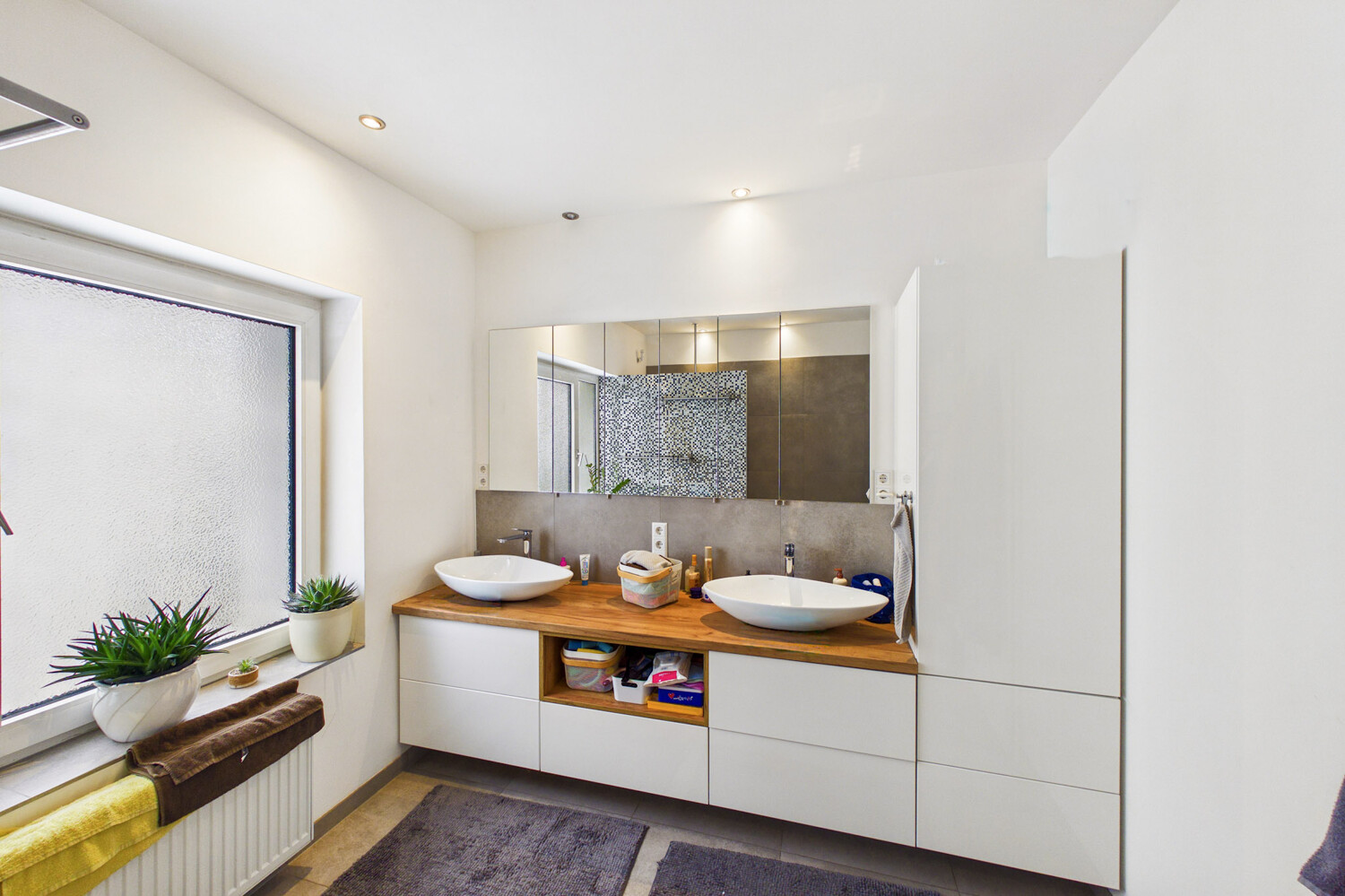 Besonderes Augenmerk liegt auf der hochwertigen Tischlerarbeit in der oberen Wohneinheit. Maßgefertigte Einbauschränke im Ober- und Dachgeschoss, individuell gestaltete Badmöbel sowie eine moderne und großzügige Einbauküche unterstreichen den hohen handwerklichen Qualitätsanspruch. Ein weiteres Highlight ist die großzügige Wohnküche, die mit ihrer offenen und hellen Gestaltung einen zentralen Treffpunkt für Familie und Freunde bildet. Hier vereinen sich Design, Funktionalität und Wohlfühlatmosphäre zu einem harmonischen Ganzen.