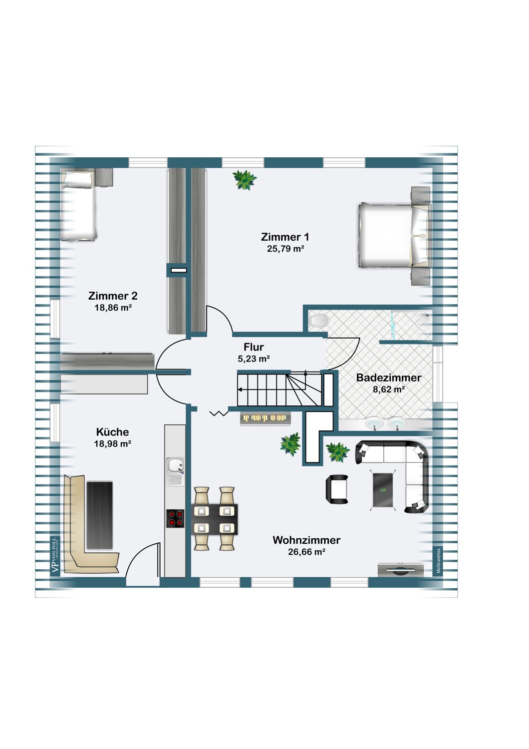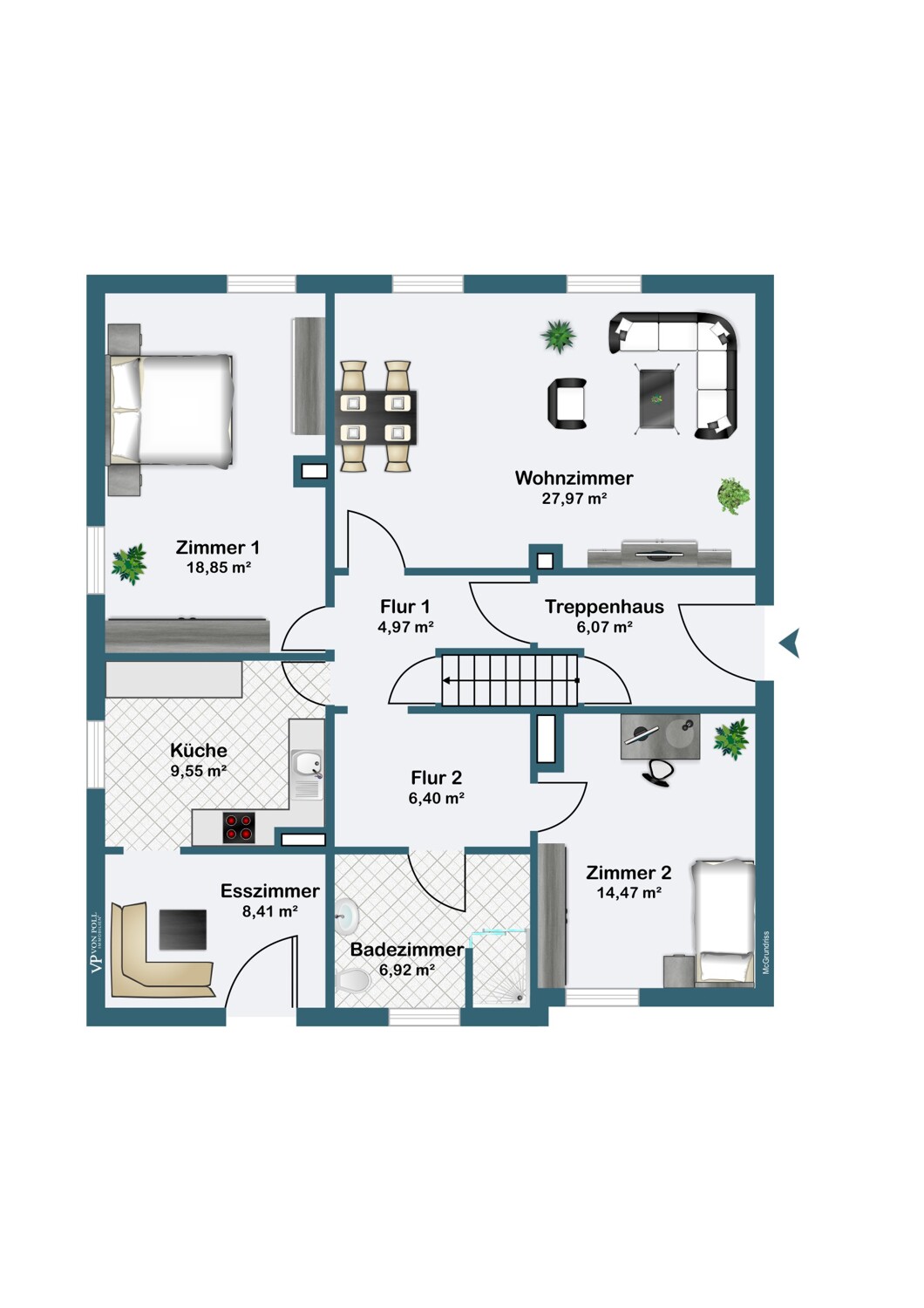Die Aufteilung in zwei separate Wohneinheiten bietet flexible Nutzungsmöglichkeiten – sei es zur Eigennutzung durch mehrere Generationen oder zur Vermietung einer Einheit für zusätzliche Einnahmen. Insgesamt stehen den Bewohnern acht Zimmer zur Verfügung, darunter fünf Schlafzimmer und zwei Badezimmer. Das ausgebaute Dachgeschoss erweitert das Platzangebot sinnvoll und schafft zusätzliche Wohnmöglichkeiten, z.B. als Büro-, Gäste- oder Rückzugsbereich.