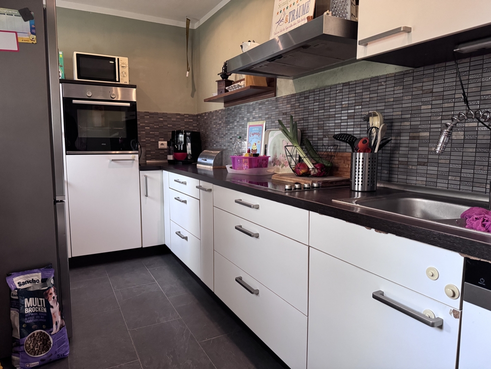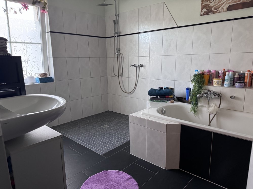 Im 1. Obergeschoss führt der Eingangsbereich direkt in das großzügige, offene Wohn- und Esszimmer. Vom Esszimmer aus gelangen Sie in die angrenzende Küche, die mit einer Einbauküche ausgestattet ist. Das renovierte Badezimmer, das sowohl über eine Dusche als auch eine Badewanne verfügt, bietet zusätzlichen Komfort auf dieser Ebene.