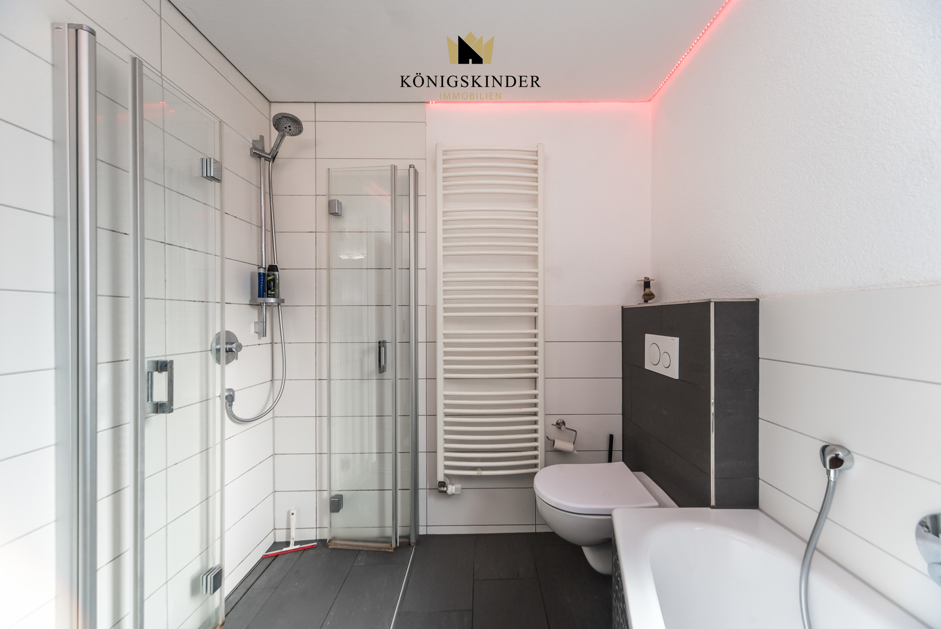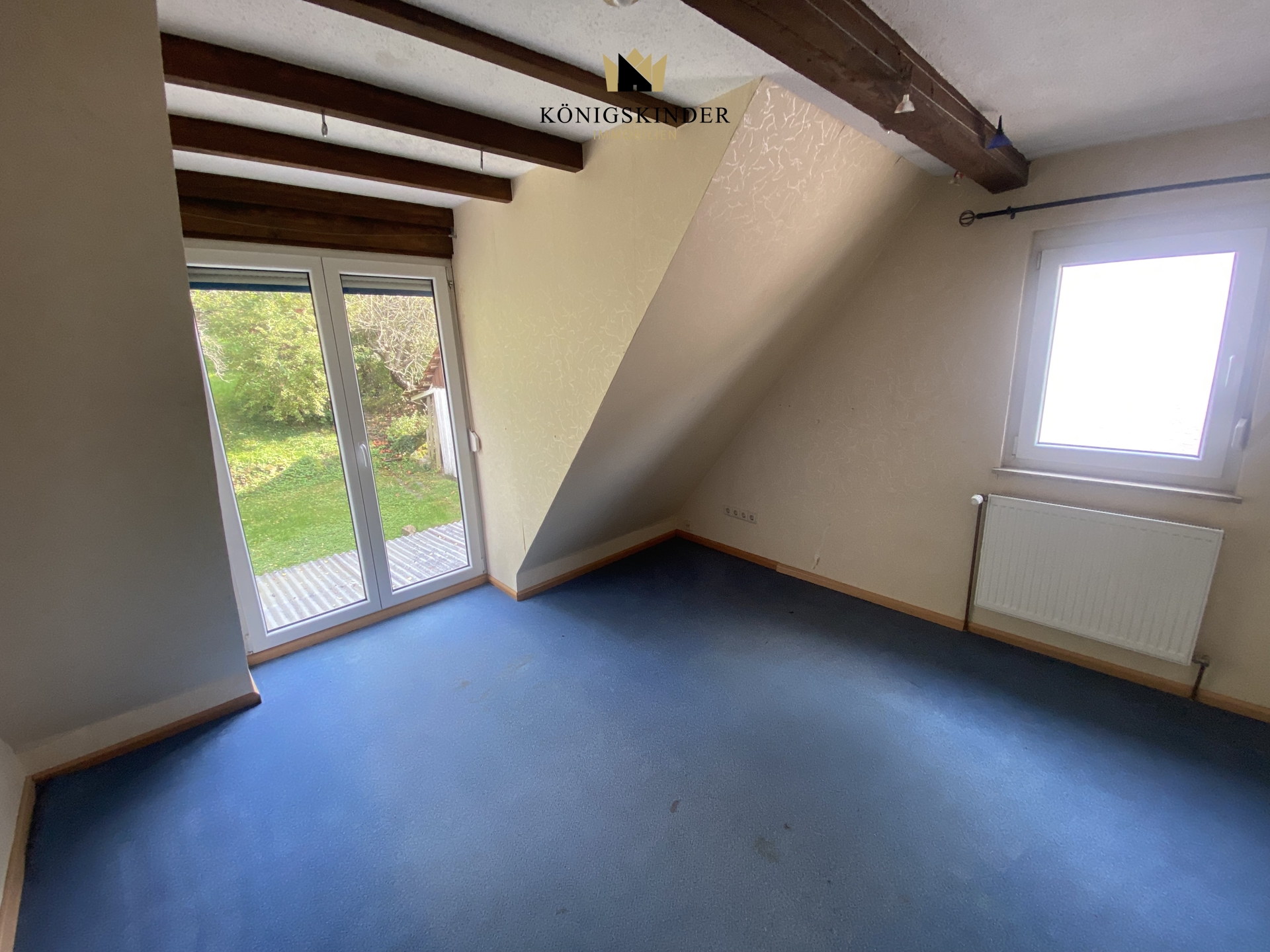 Im oberen Geschoss finden sich zwei Schlafzimmer sowie ein Gäste-WC. Über eine weitere Treppe gelangt man in das ausgebaute Dachgeschoss, das mit einem großzügigen Schlafzimmer und einem vorgelagerten Raum zusätzliche Wohnqualität bietet – ob als Elternbereich, Jugendzimmer oder ruhiges Homeoffice.